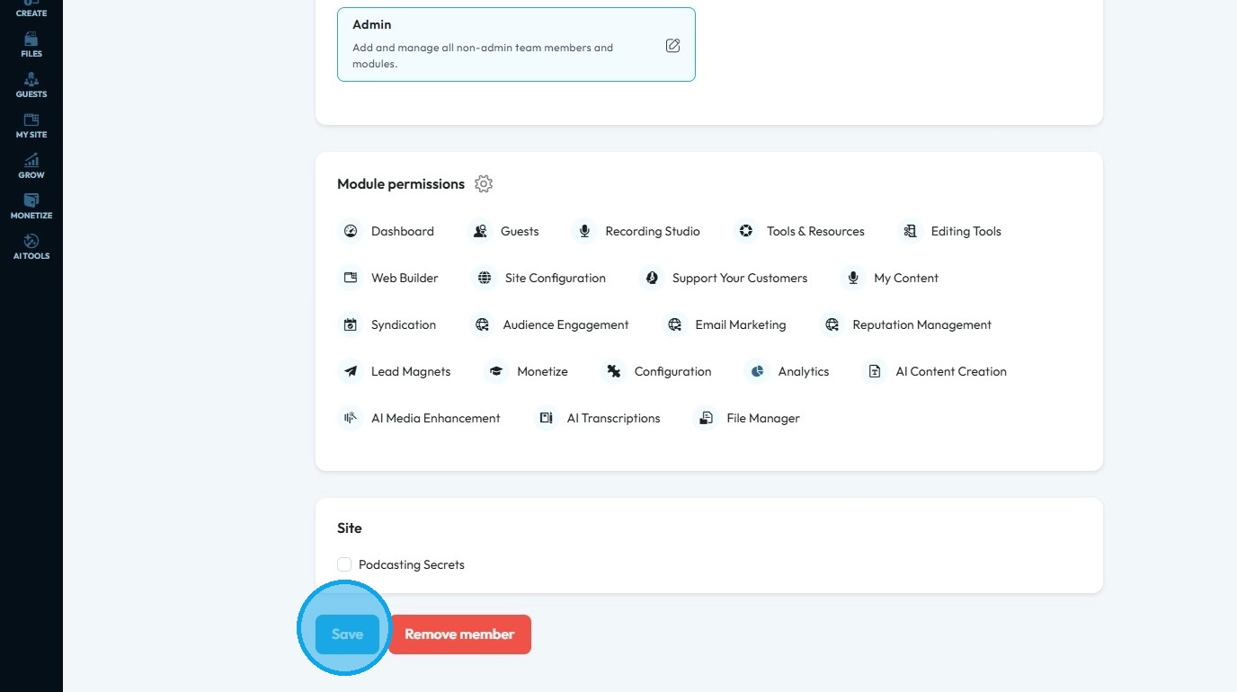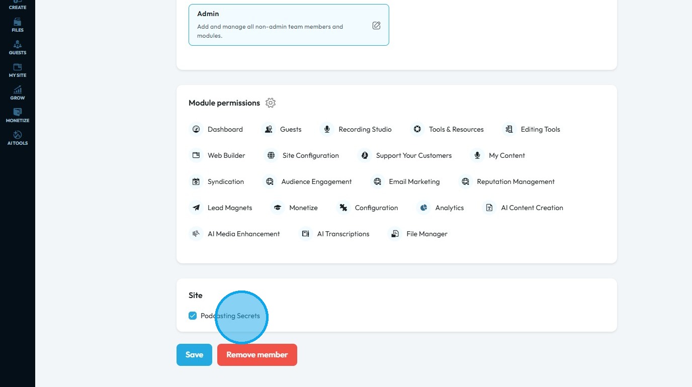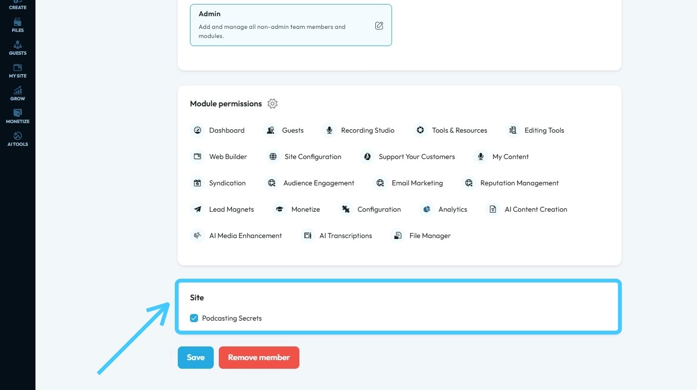 7. Scroll down, and at the bottom, you can see if the team member has site access or not