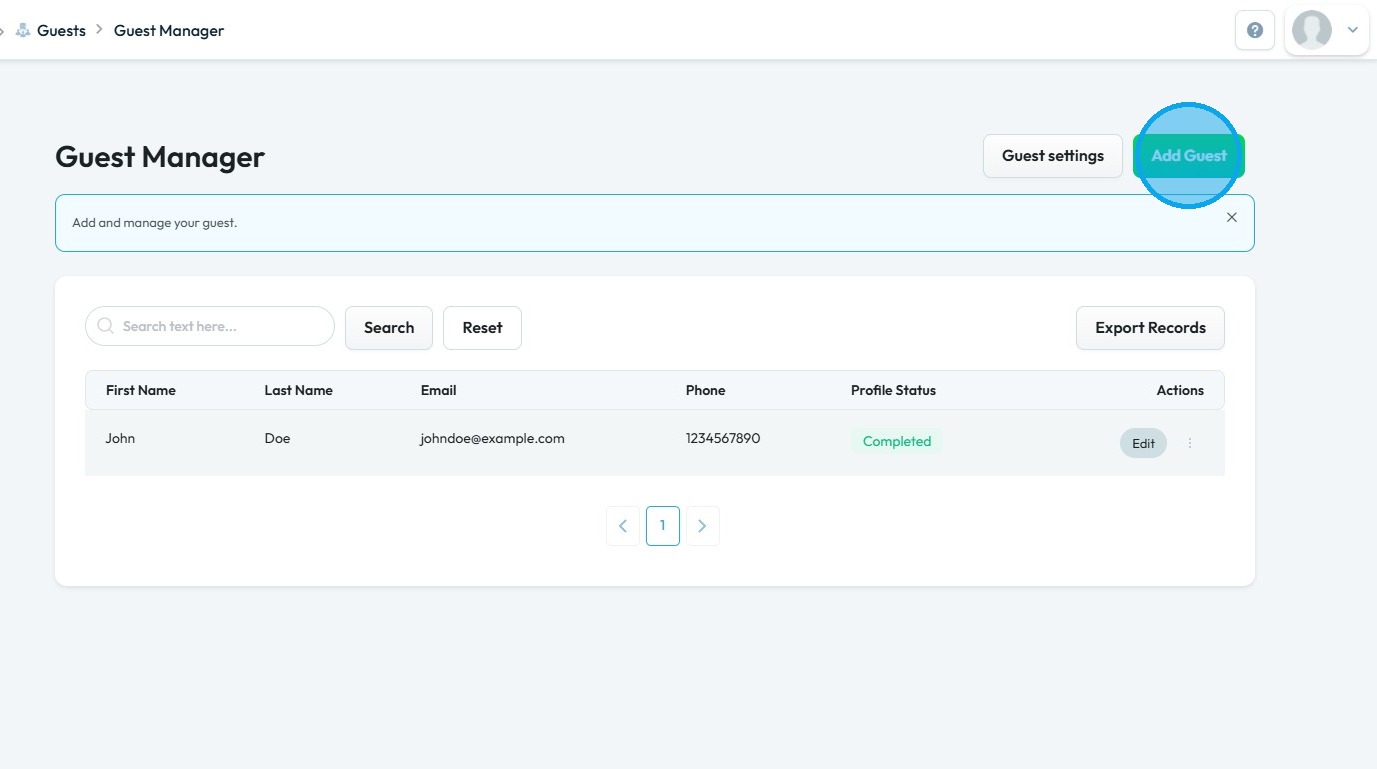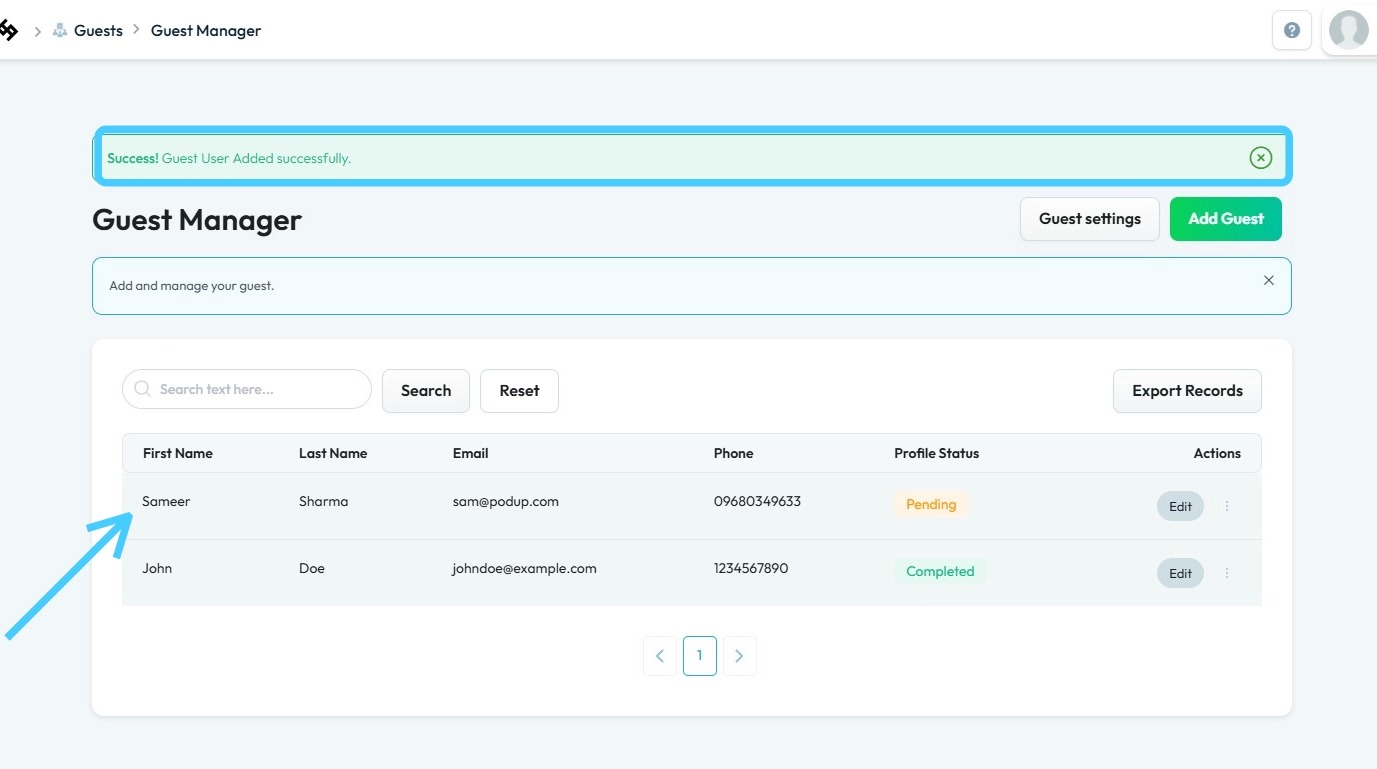 9. The message “Success! Guest User Added Successfully” will be displayed, granting access to Guest Manager, where you can add, manage, search, reset, and export guest records.