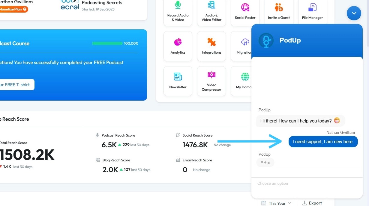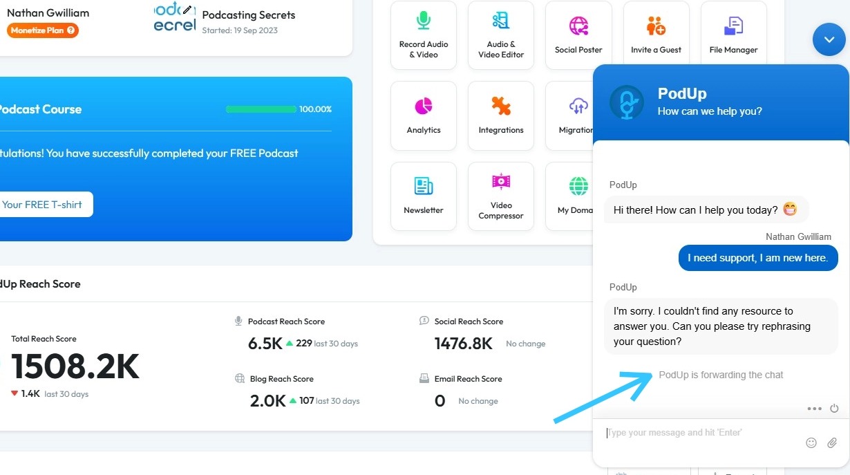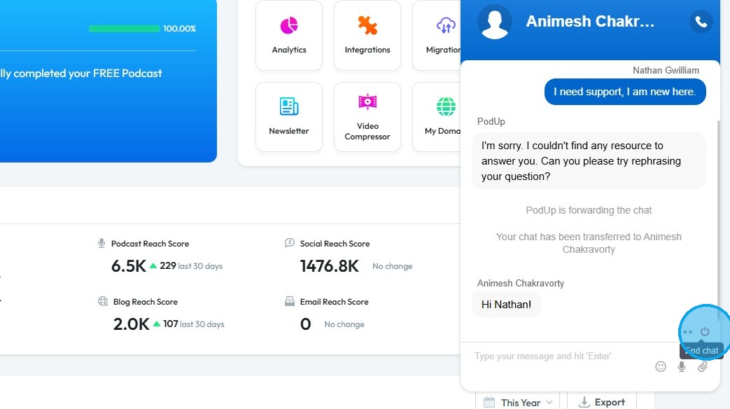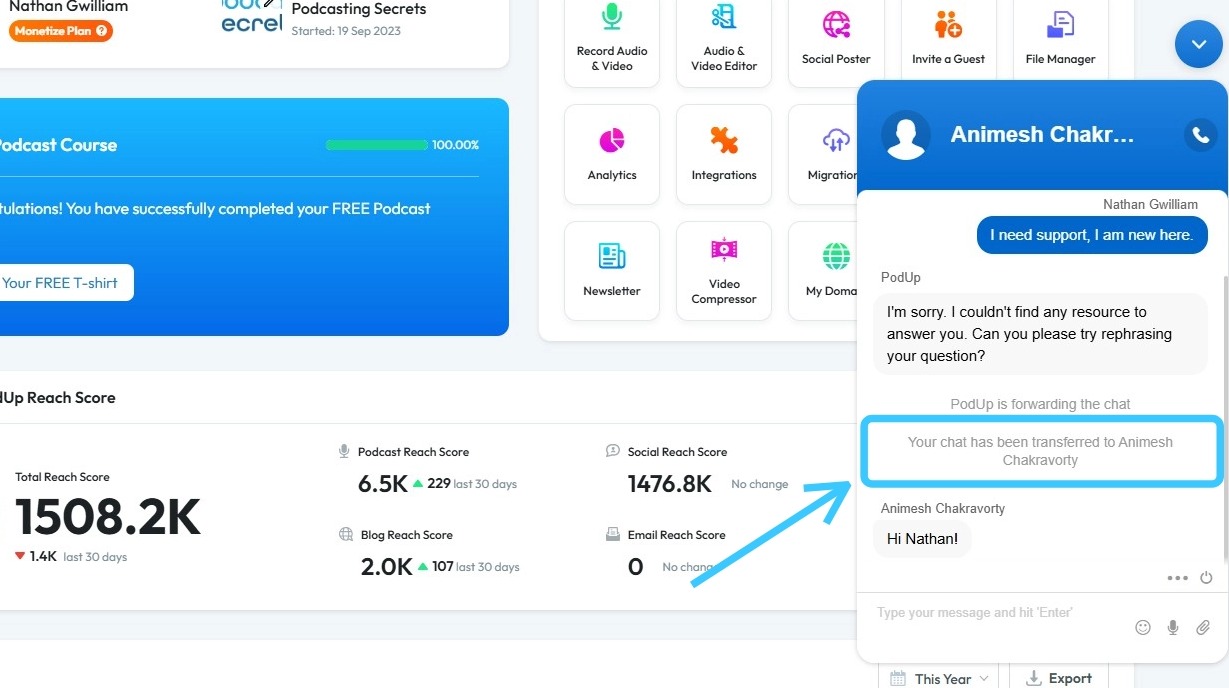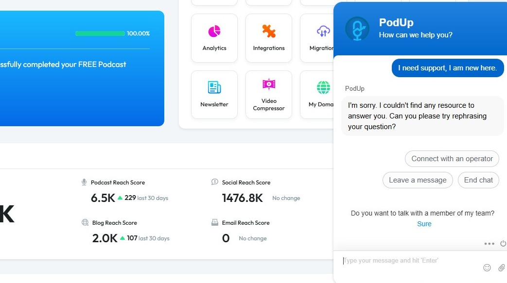 7. PodUp will route the chat to Customer Support