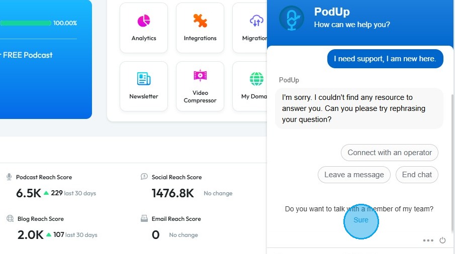 6. Alternatively, you can click “Sure” under “Do you want to talk with a member of my team” to connect with customer support.