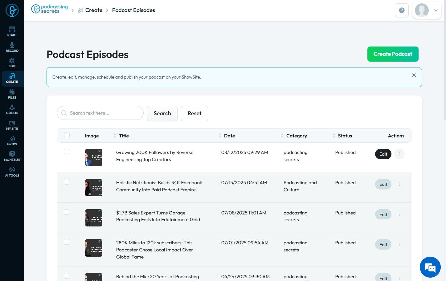 4. Click on "Edit" beside the podcast episode you want to optimize for SEO