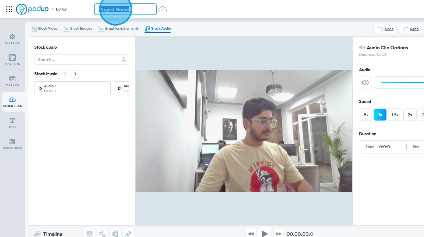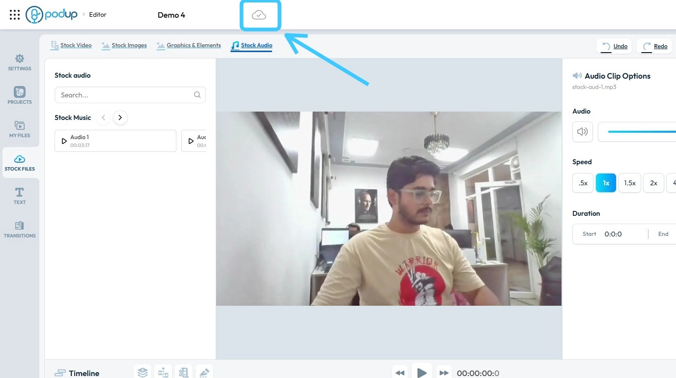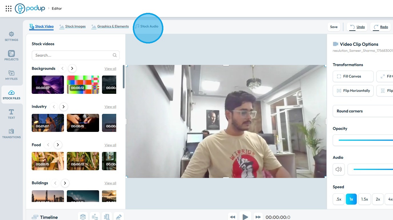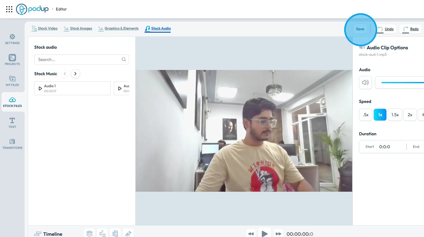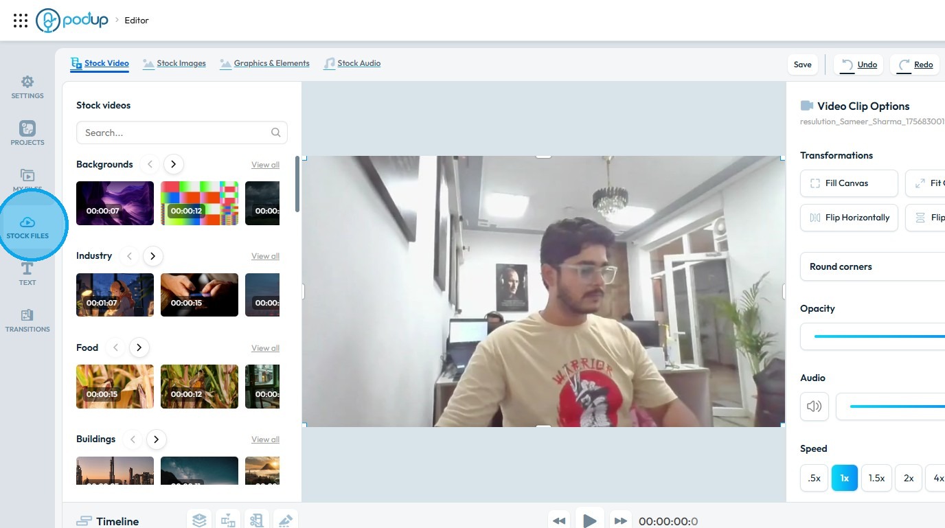 Use this guide to add and save graphics in your videos with PodUp’s editor. 1. Navigate to https://editor.podup.com/ 2. Load a video onto the ‘Timeline' 3. To add a "Graphics & Elements" click "Stock Files" 4. Select "Graphics & Elements" 5. Drag and ...