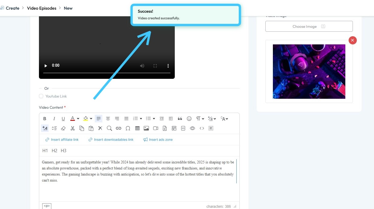 8. A "Success!" message will appear, confirming that your video has been successfully published on your website