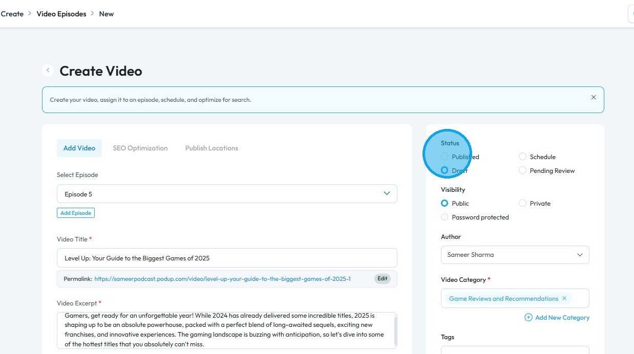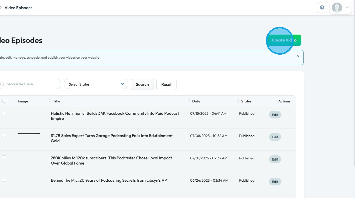 This guide shows you how to easily upload and manage video episodes on your website to boost your online presence 1. Navigate to https://app.podup.com/home 2. Click "Create" 3. Select "Videos" 4. Click "Create Video" 5. The "Create Video" page will ...