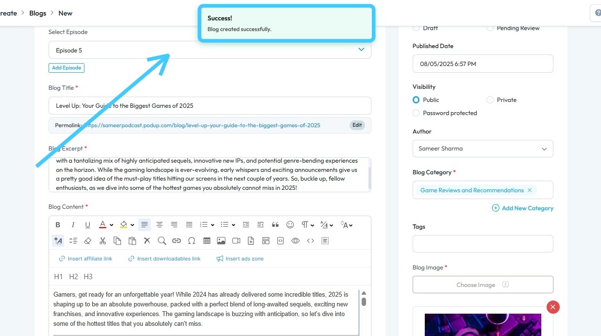 8. A "Success!" message will appear, confirming that your blog has been successfully published on your website