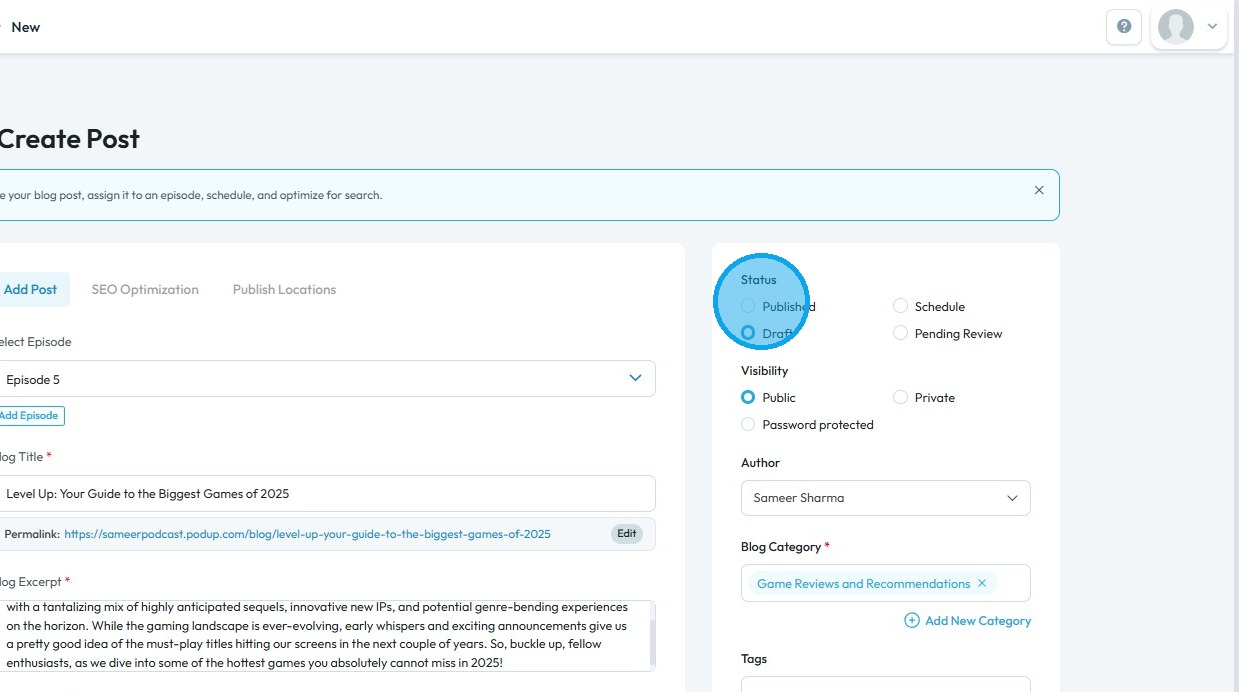 6. Complete all required details and select "Published" in the Status section. A filled circle will indicate your selection.
