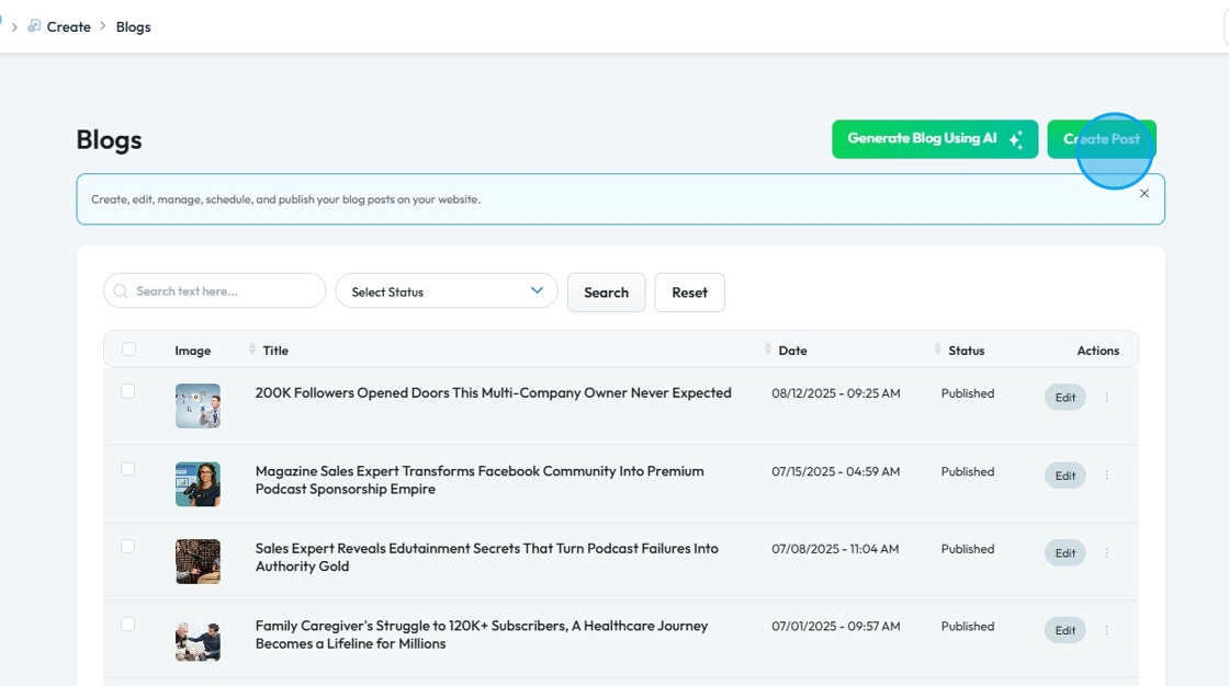 This guide shows you how to create a blog step by step. It covers SEO, categories, and social sharing to help you reach more people and grow your online presence. 1. Click "Create" 2. Click "Blogs" 3. Click "Create Post" to write your own blog or ...