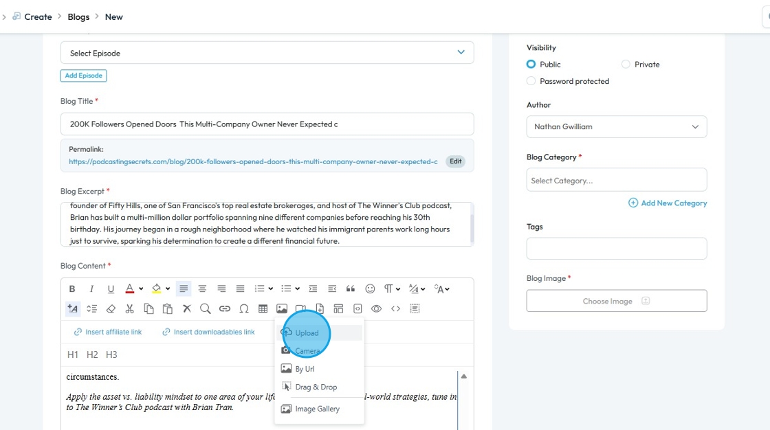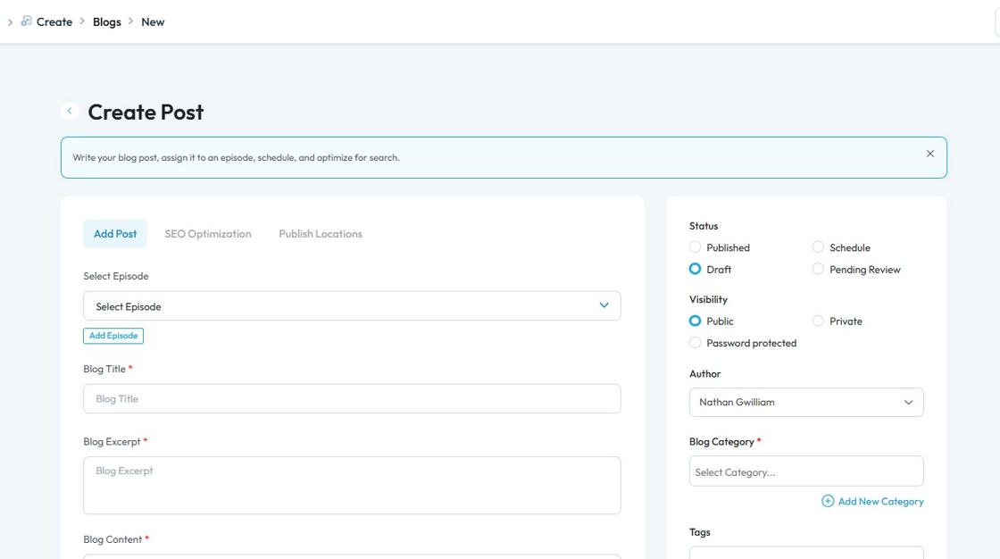 This guide makes it easy to create a blog post to enhance the content with relevant tags in PodUp to easily navigate your platform and optimize the blog for greater visibility. 1. Navigate to https://app.podup.com/home 2. Click "Create" 3. Select ...