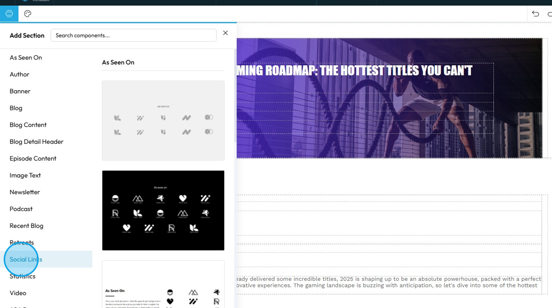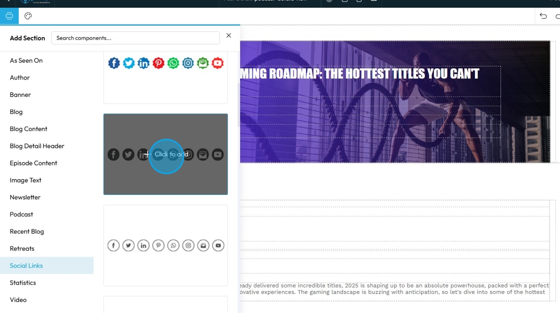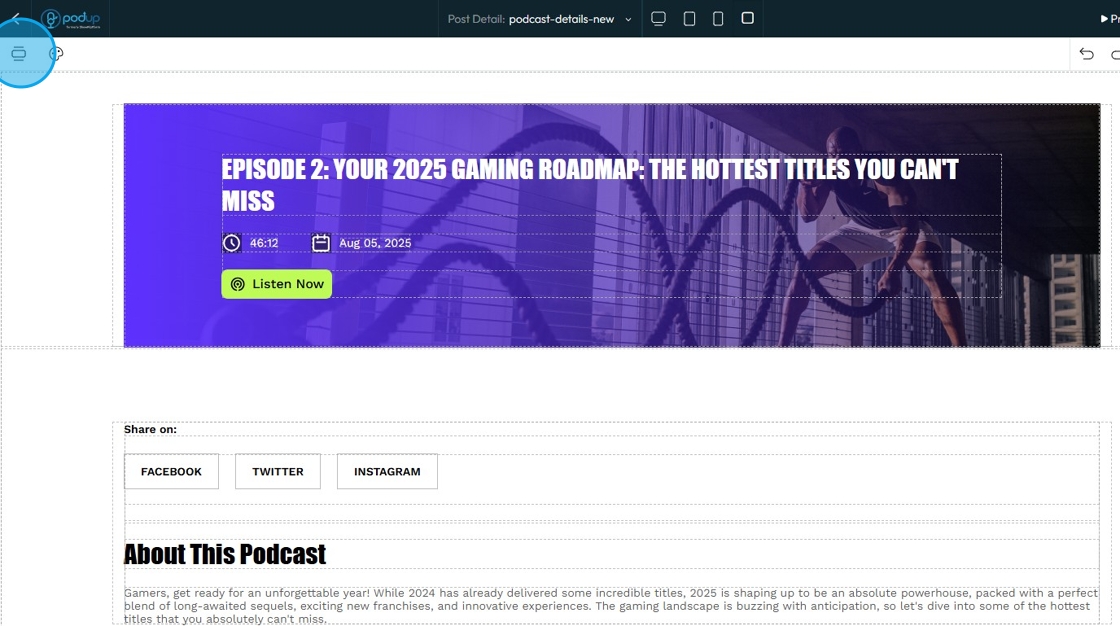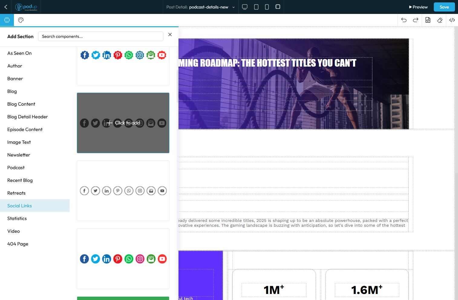 17. The PodUp Post Page Builder will load. Click the "Component" section