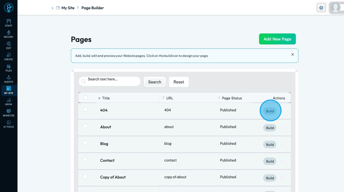 5. Click "Build" on the page you want to edit