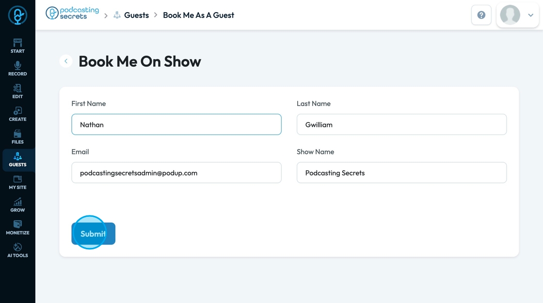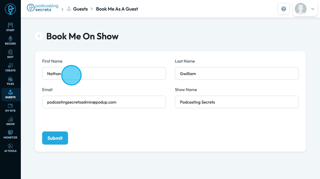 4. All of the text boxes should be filled out. If not, enter your first name, last name, email, and show name into their respective fields