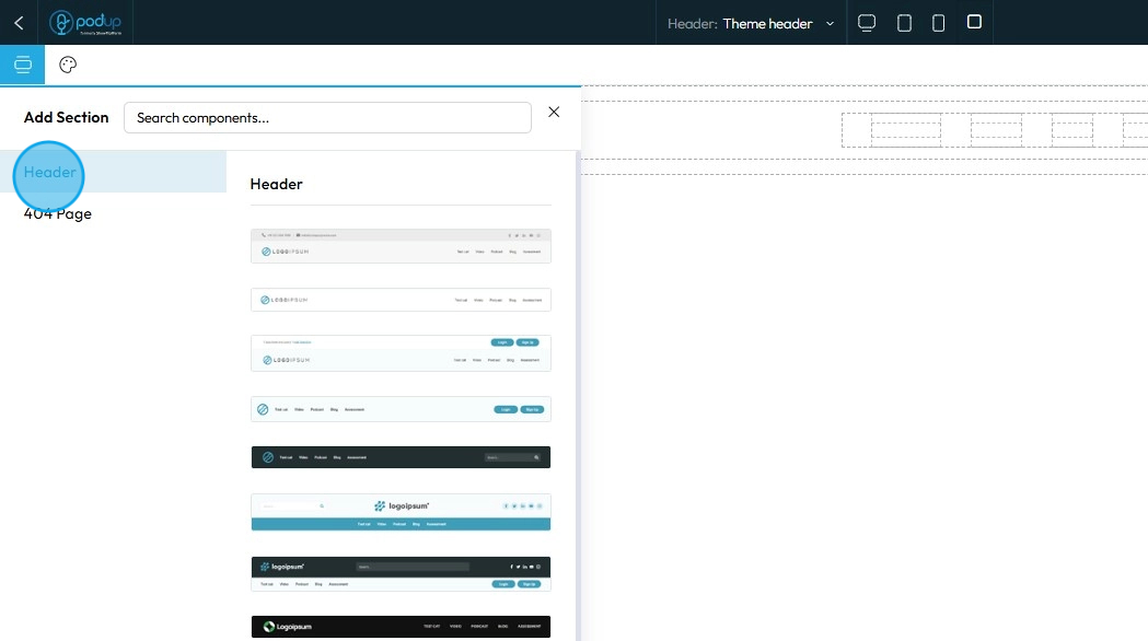 5. Choose 1 of 20+ header templates, click to add it to the page