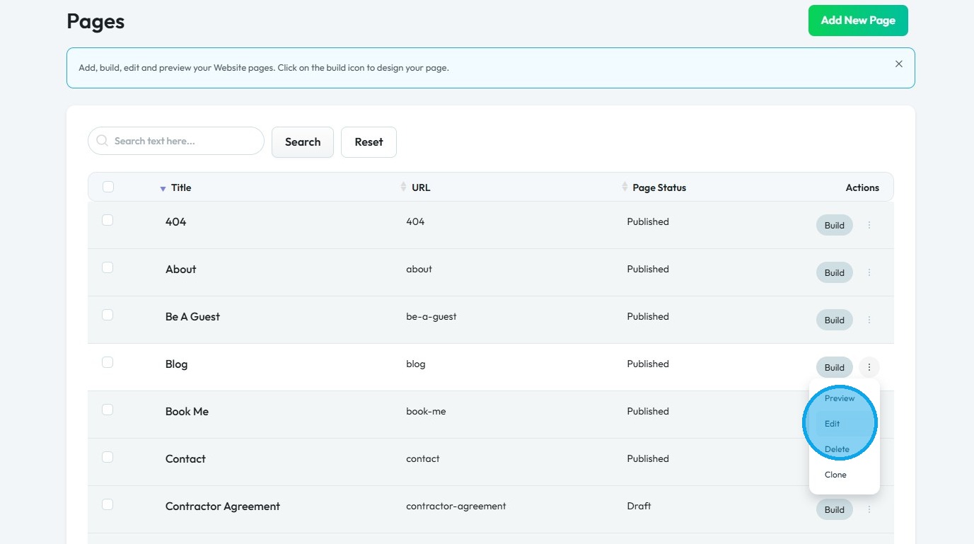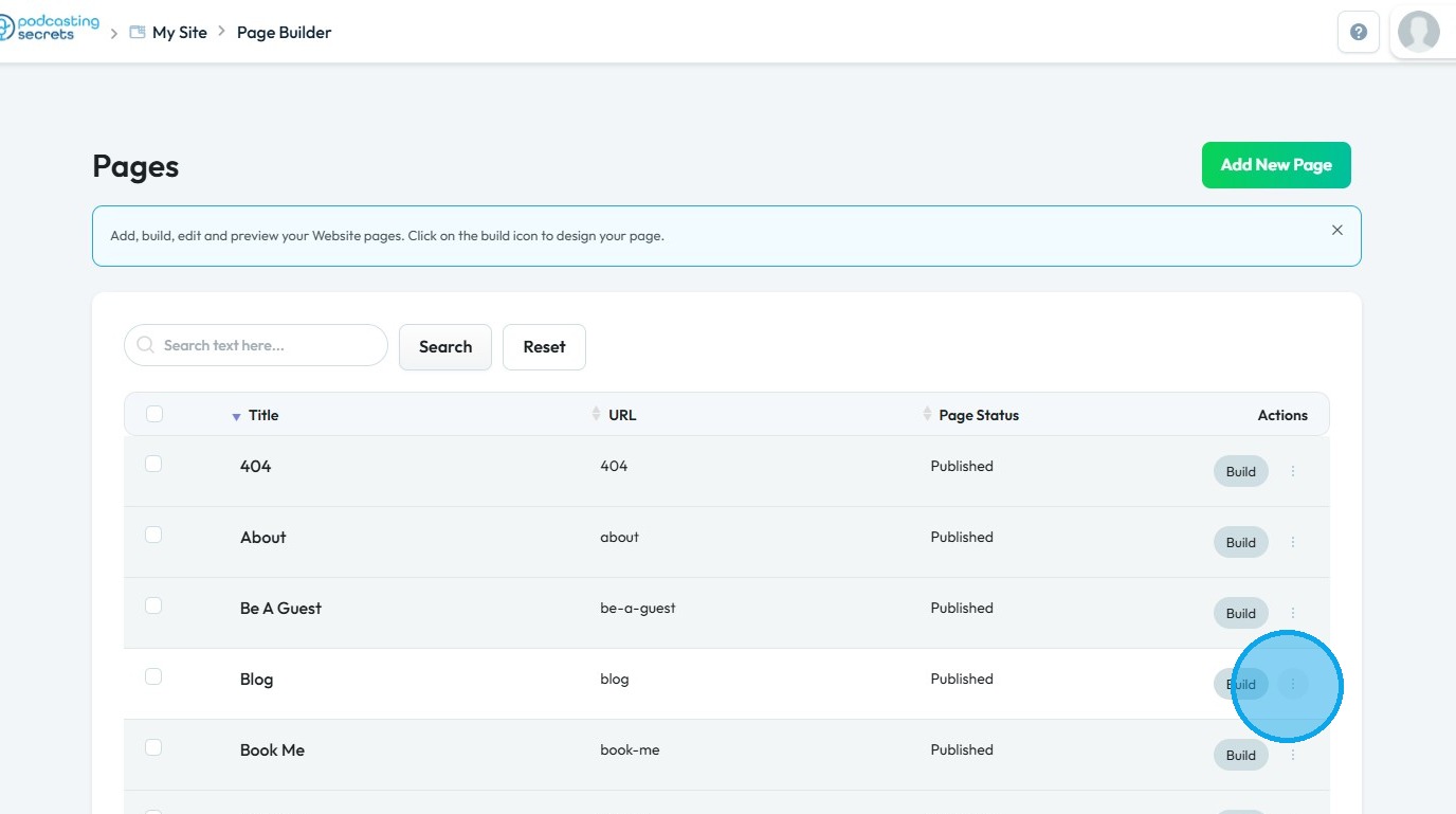 5. Click the "3 Dots" button of the page you want to convert into "Home Page"