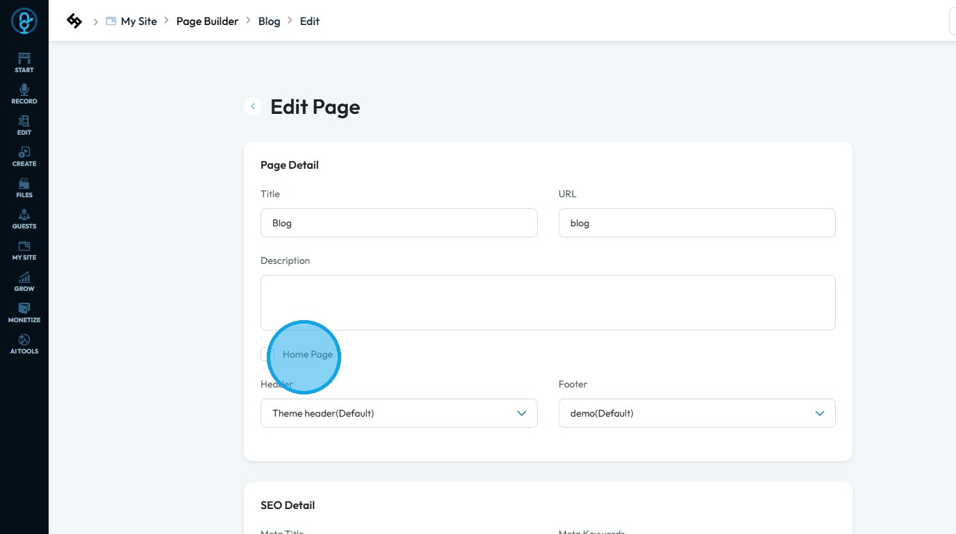 8. In the “Edit Page” section, make sure the “Home Page” checkbox is selected
