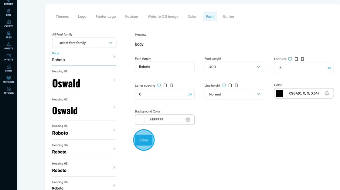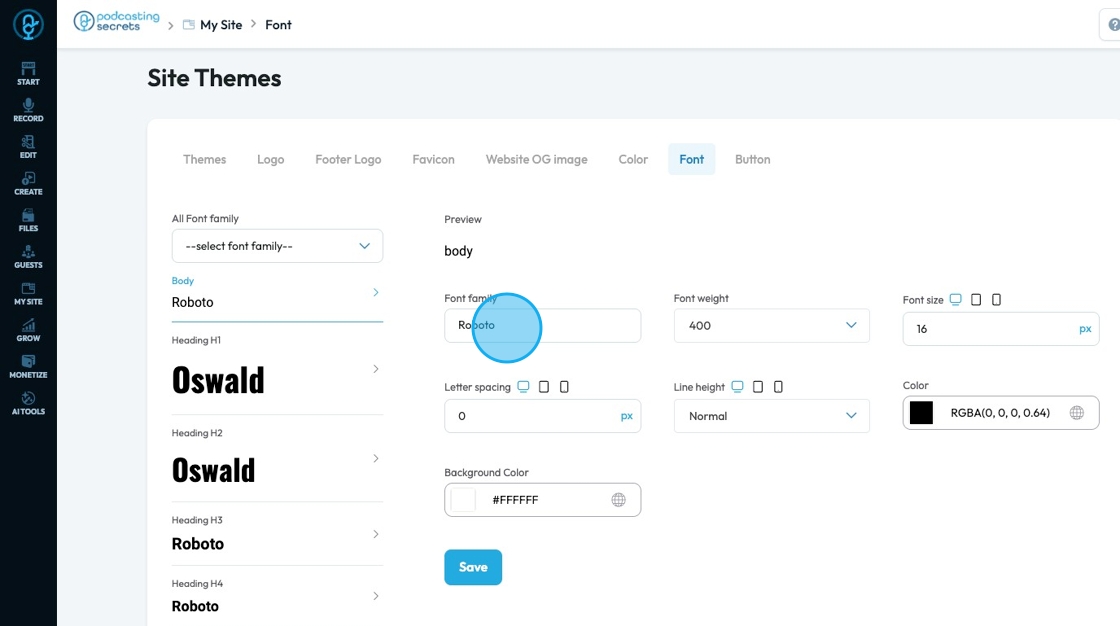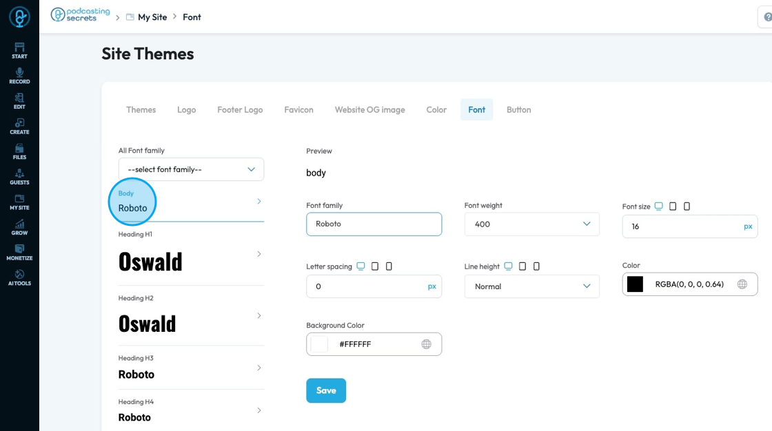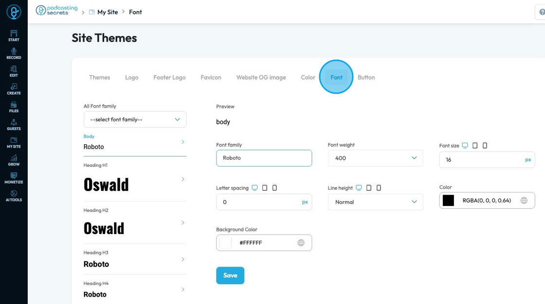 This guide shows you how to change the font for all text on your website. Follow the steps to pick a font that improves your site’s look and matches your brand. 1. Navigate to https://app.podup.com/home 2. Click "My Site" 3. Click "Site Themes" 4. ...