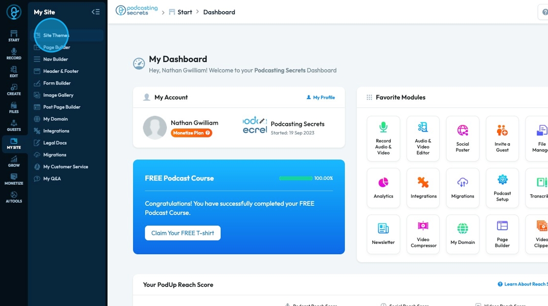 By following this guide, you can easily change your PodUp site theme to match your brand and enhance user experience. 1. Navigate to https://app.podup.com/home 2. Click "My Site" 3. Select "Site Themes" 4. The ‘Site Themes’ page will load 5. The ...