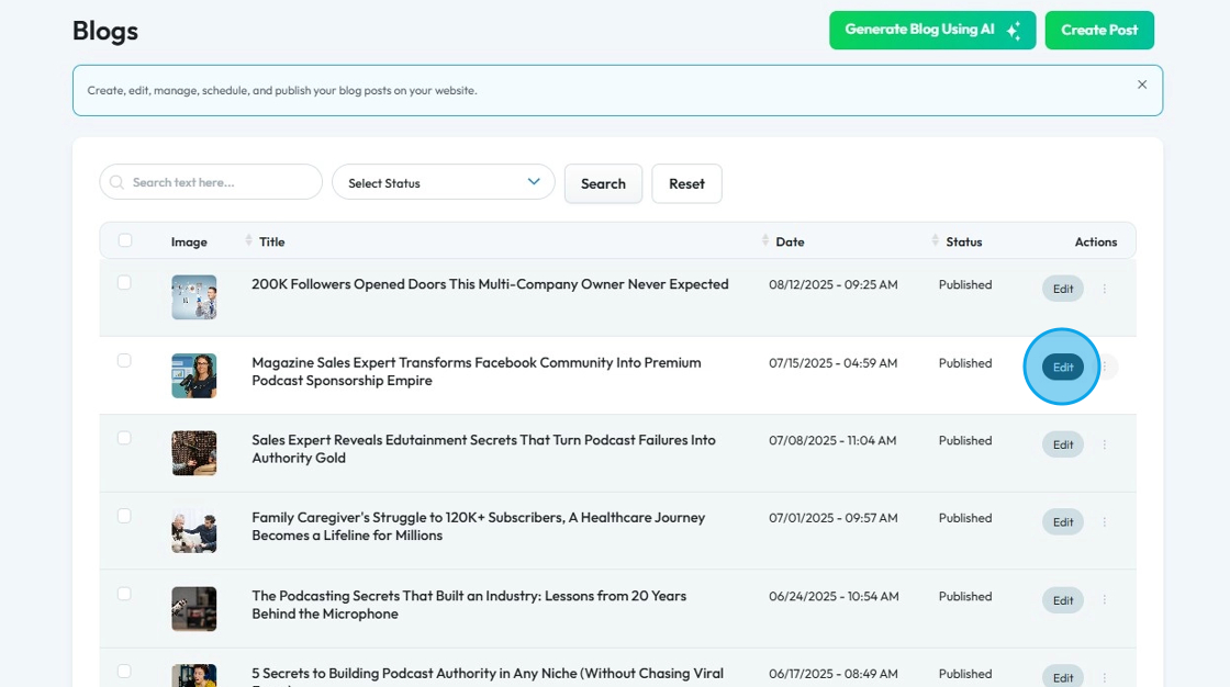 This guide shows you how to use AI to create blog posts faster. It covers generating titles, optimizing for SEO, and adjusting tone and audience to make your content more effective. 1. Click "Create" 2. Click "Blogs" 3. Click "Generate Blog Using AI" ...