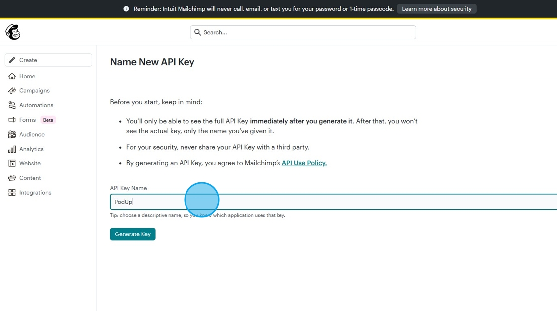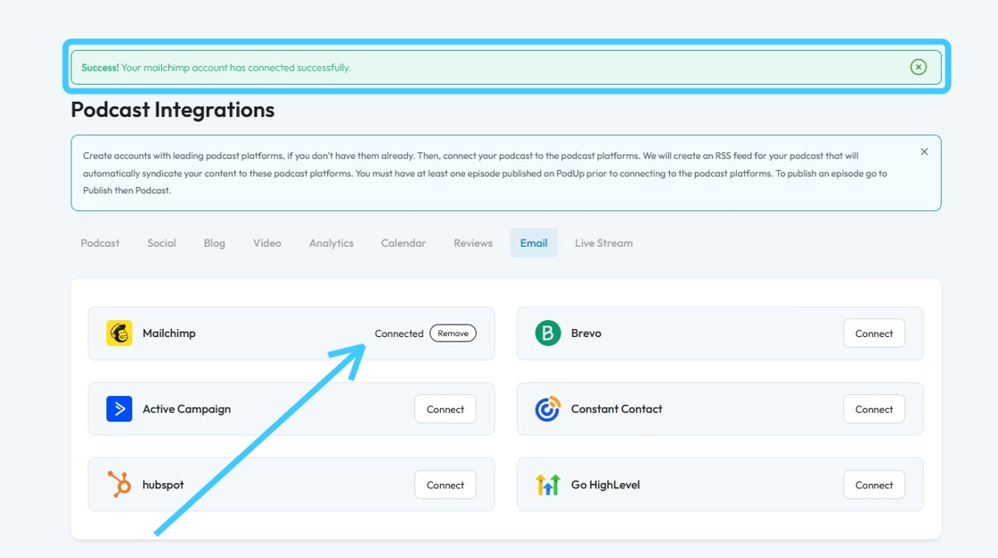 22. Go back to "Mailchimp Integration" page on PodUp.
