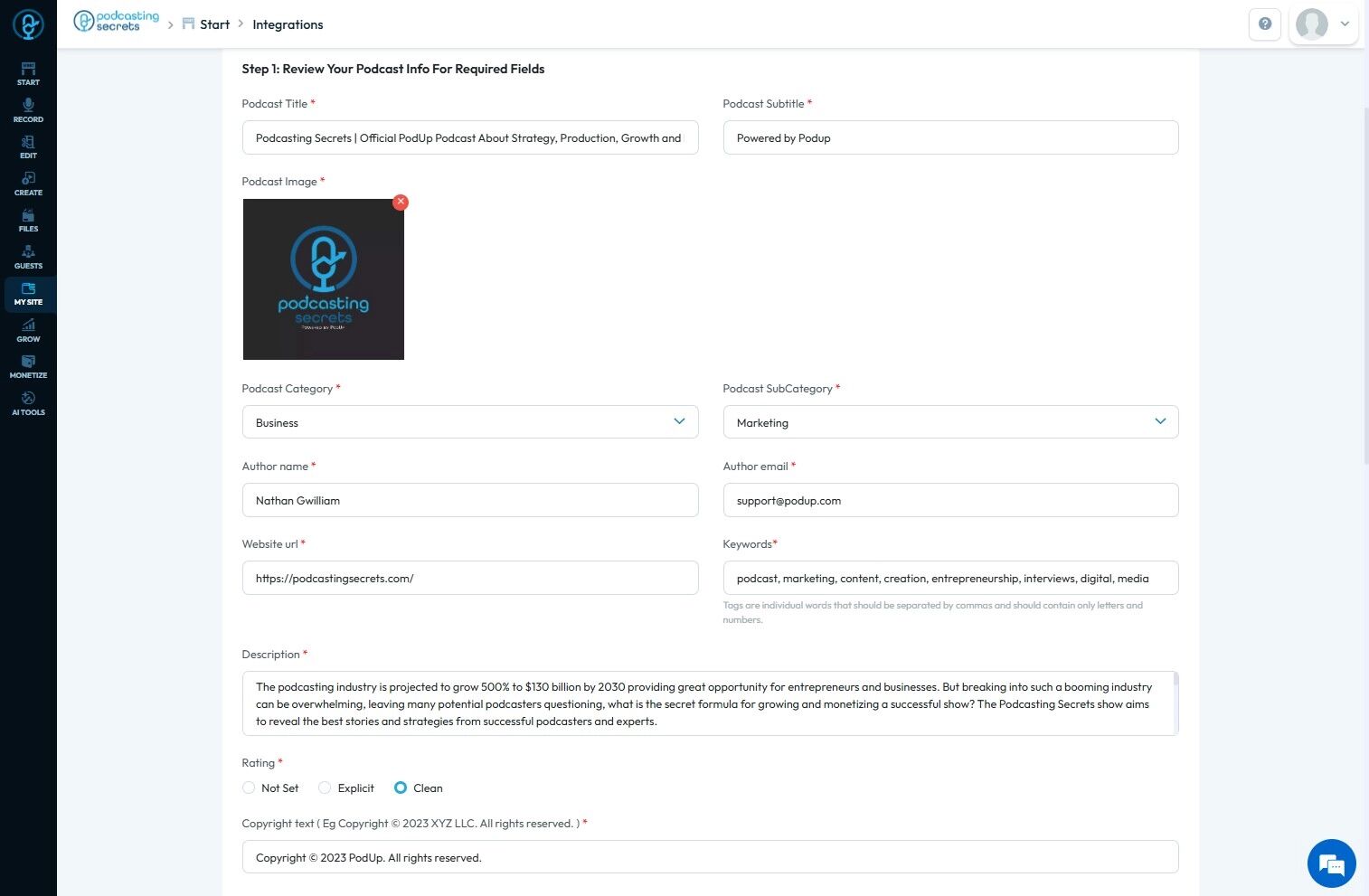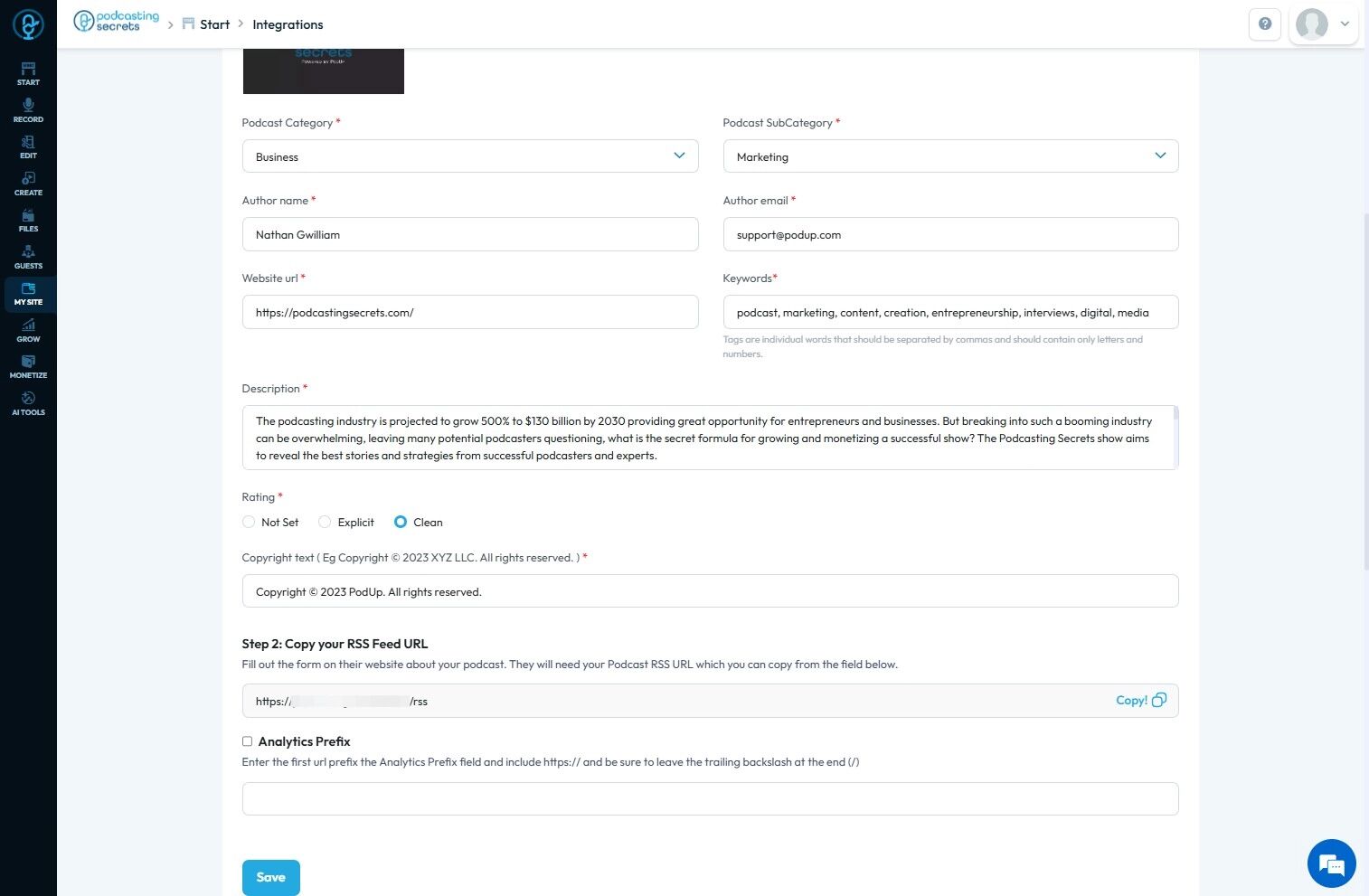 9. Now on the "Podcast Integrations" page, make sure you have filled in all the required fields.