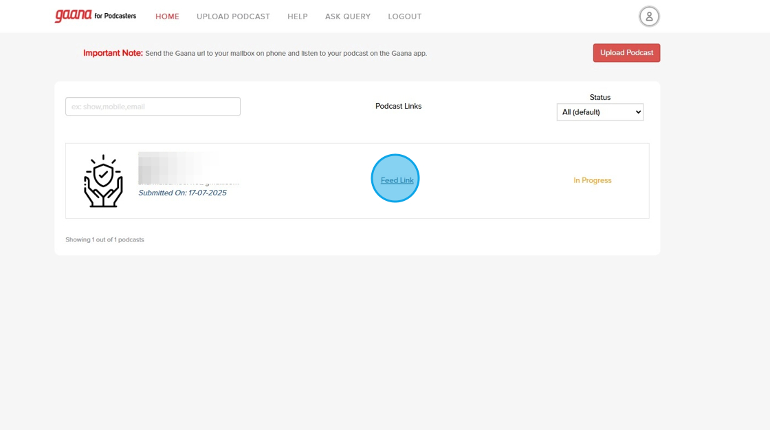 20. You will be redirected to the "Home page" of "gaana for Podcasters". Click "Feed Link" on this page.