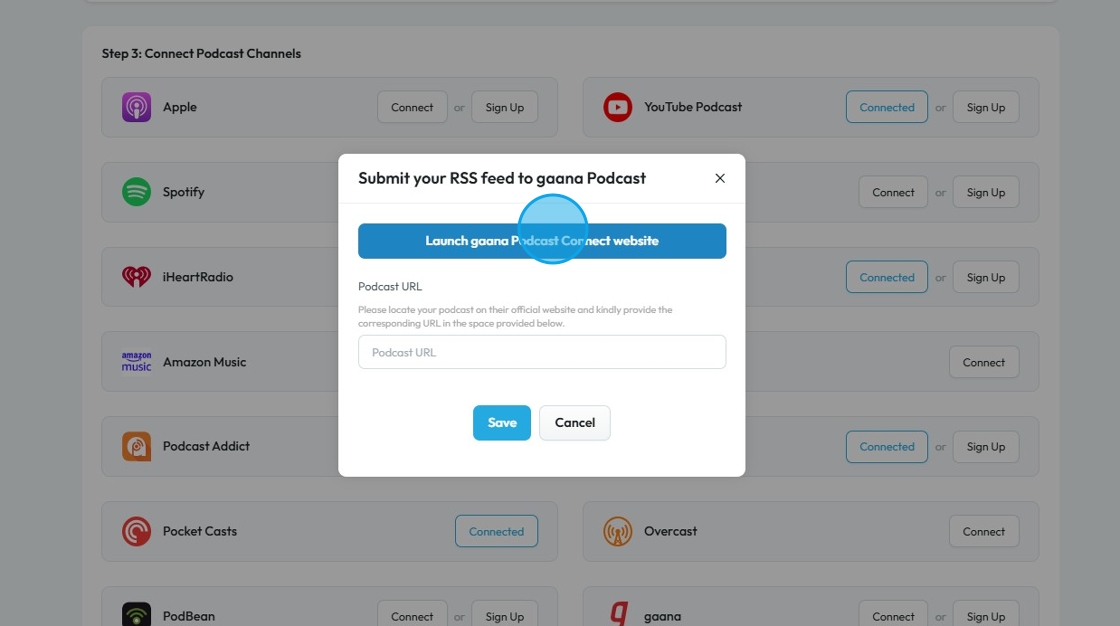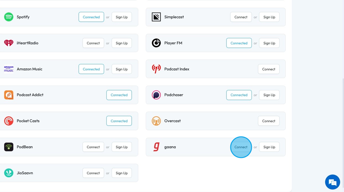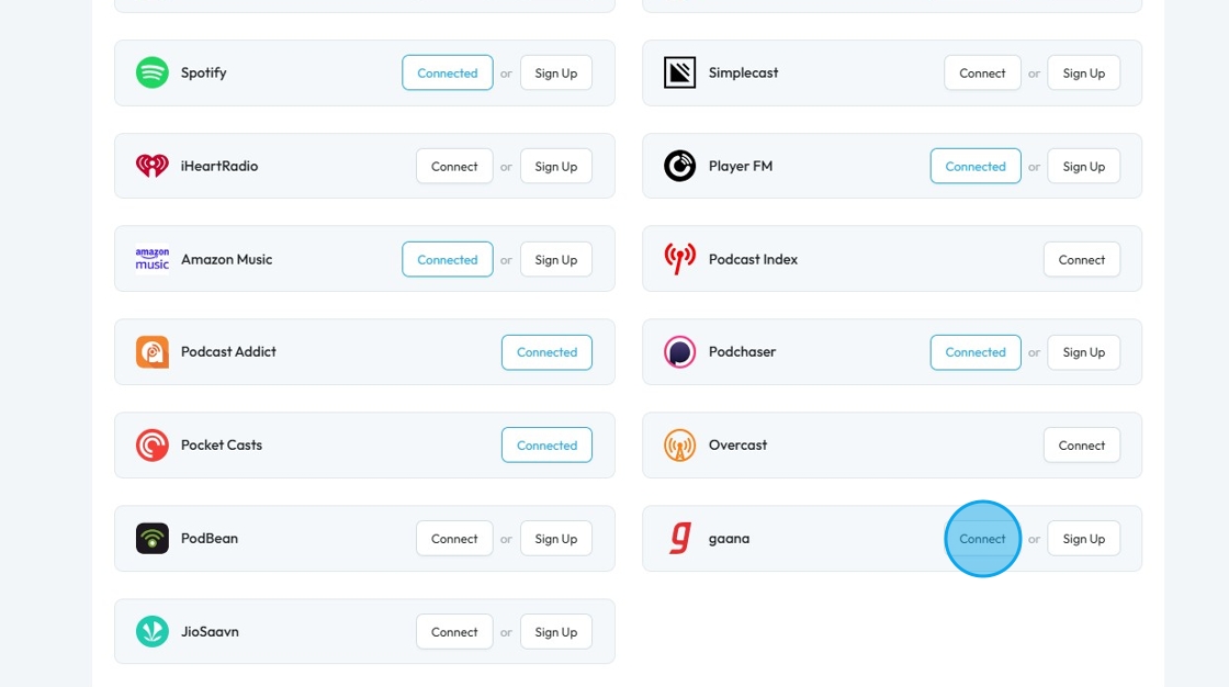 23. Go back to "Podcast Integrations" page and click "Connect" button of "gaana"