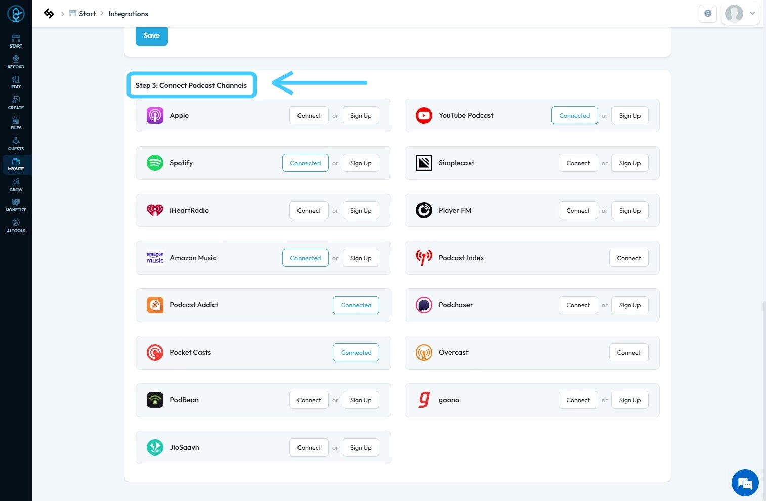 10. Scroll down and you will have "Step 3: Connect Podcast Channel" section.