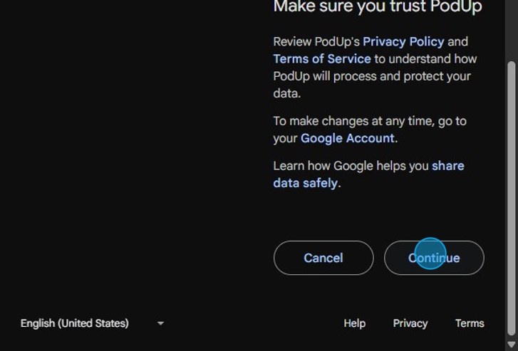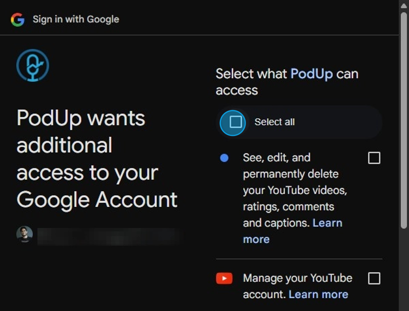 15. Click the "Select all" check box to permit PodUp to access all these features