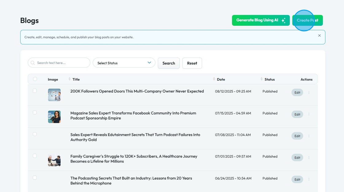 This guide shows you how to use AI to create blog posts faster. It covers generating titles, optimizing for SEO, and adjusting tone and audience to make your content more effective. 1. Click "Create" 2. Click "Blogs" 3. Click "Generate Blog Using AI" ...