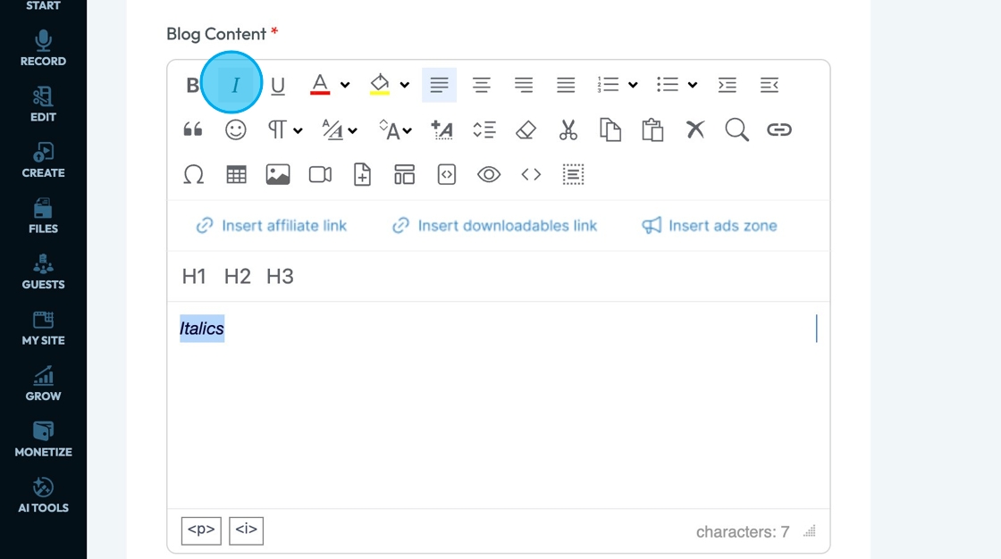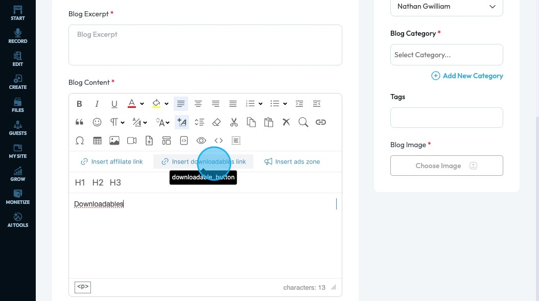 69. Click "Insert Downloadables Link" to add a downloadable to your file
