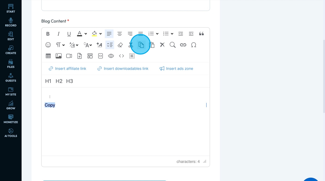 24. Click "Copy" - the icon with 2 pieces of paper - to make a duplicate of the selected text, image, or element and temporarily stores it so you can paste it somewhere else — without removing it from the original spot.