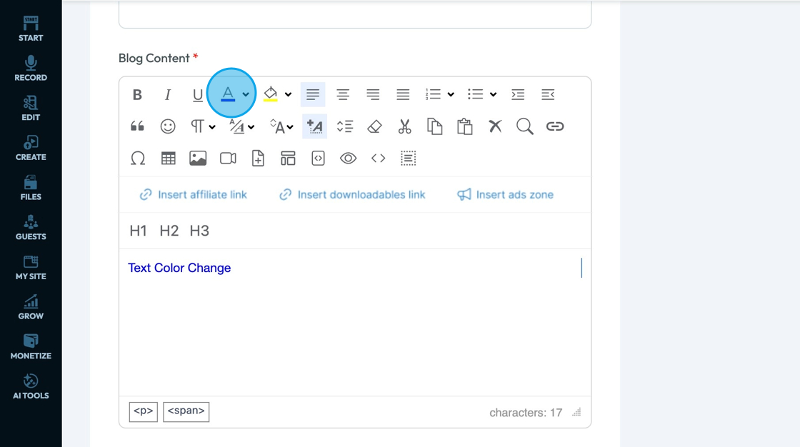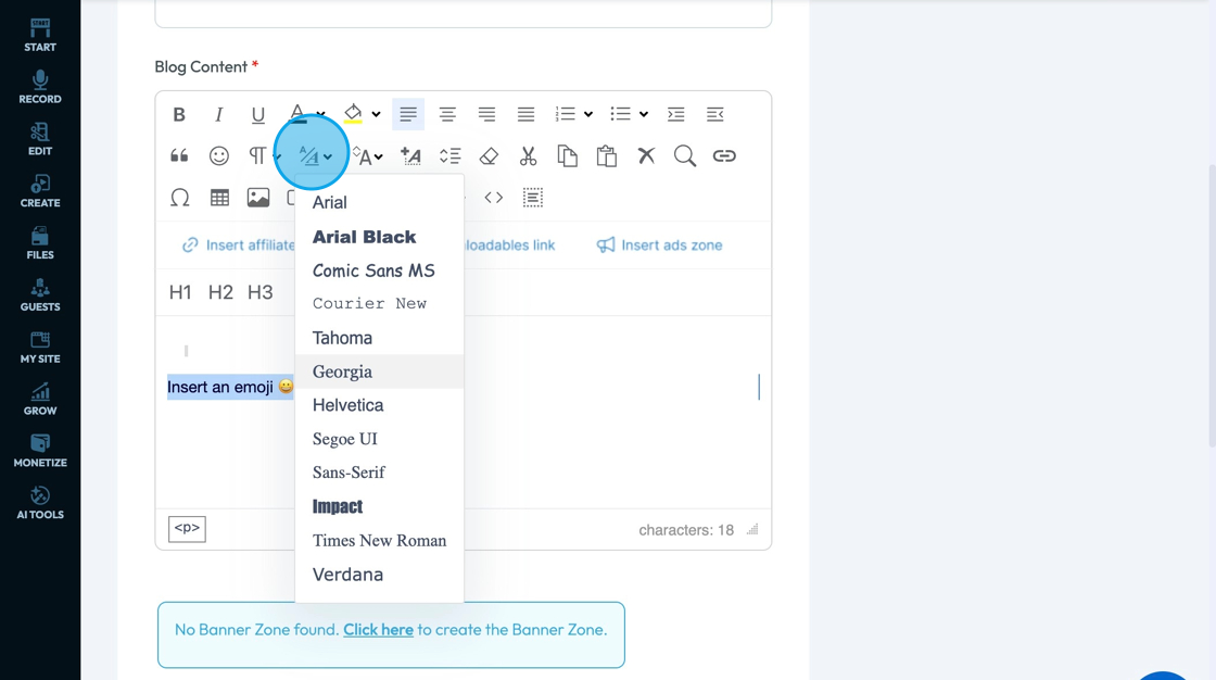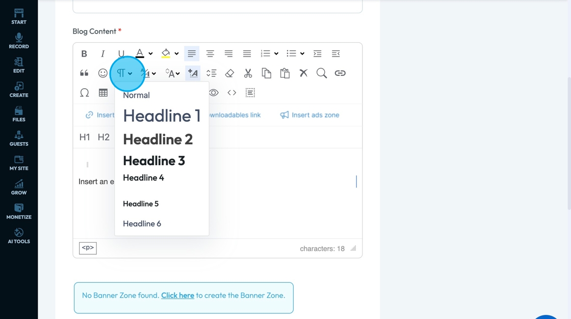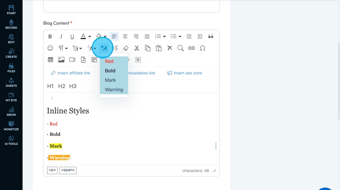 20. Click "Inline styles" - the A with a plus sign - to change the format of the text to align with preprogrammed formats to convey a specific tone.