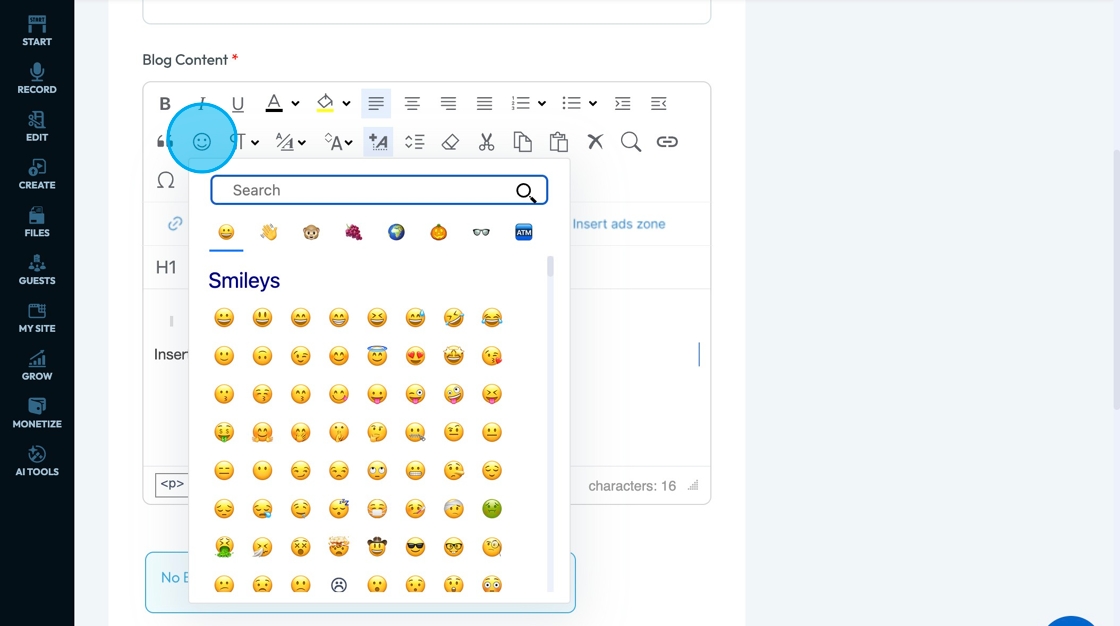 16. Click "Emojis" - the smiley face - to insert and emoji to add character to your text box