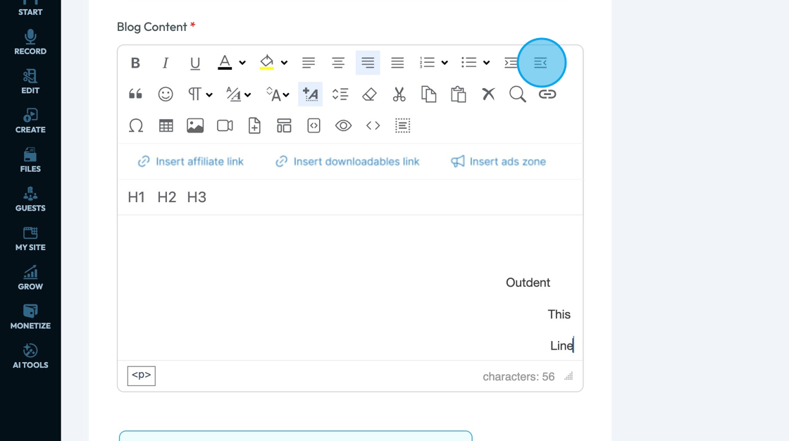 14. Click "Outdent" - the lines with an arrow on the right side - to move the selected line more to the left