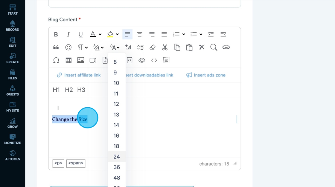 19. Click "Change the Size" - the A with 2 arrows pointing up and down - to change the size of the text