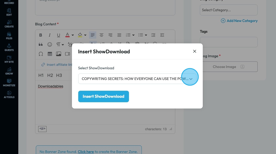 70. Select the ShowDownload from a dropdown menu and select "Insert ShowDownload" to put the link in the text