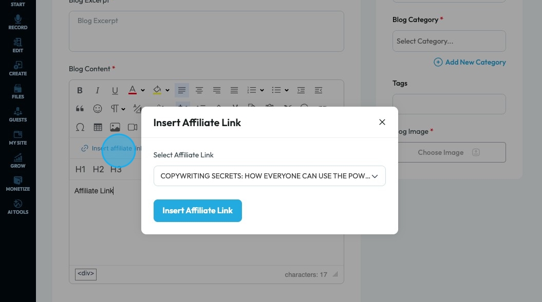 68. Select the affiliate link from a dropdown menu and select "Insert Affiliate Link" to put the link in the text