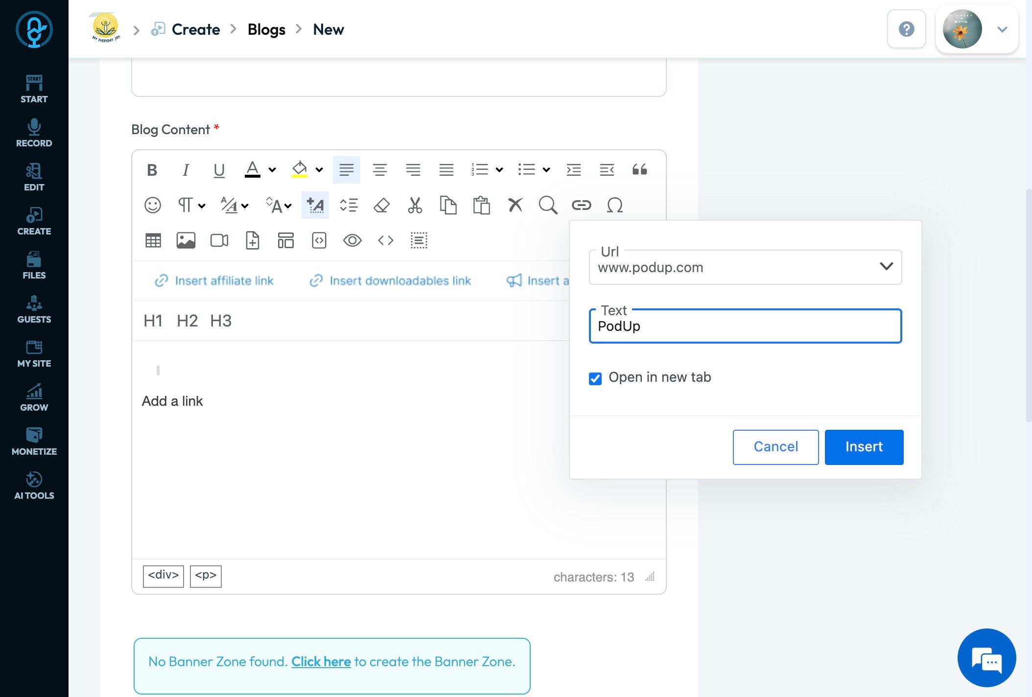 An affiliate link here would link to a product you have selected that your readers might want to purchase, like a podcasting book for a podcast on podcasting.