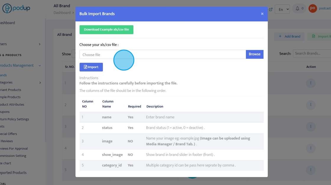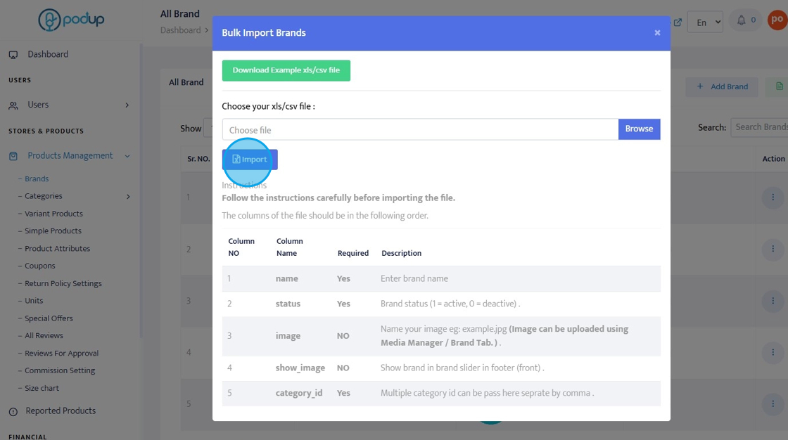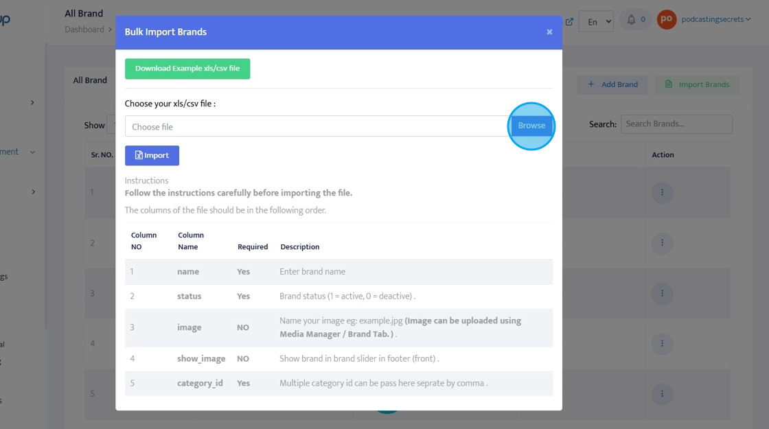7. Click "Choose your xls/csv file" to import multiple brands at once