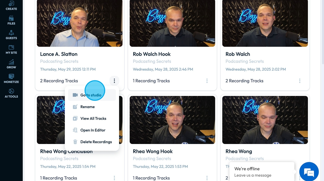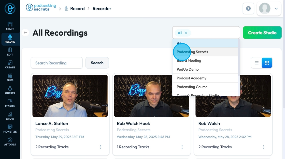5. To filter recordings by the studio, click "All" to see a dropdown menu of all the studio