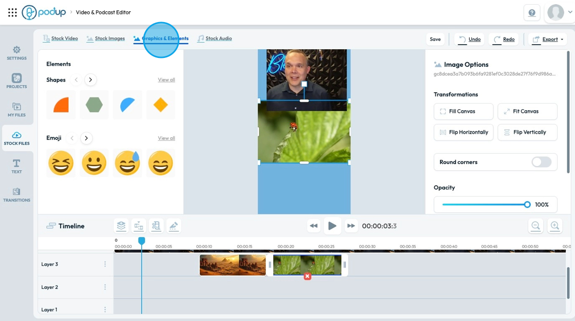 45. Click "Graphics & Elements" to add shapes and emojis to your video file.
