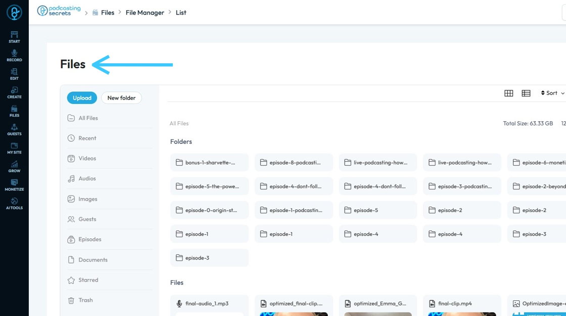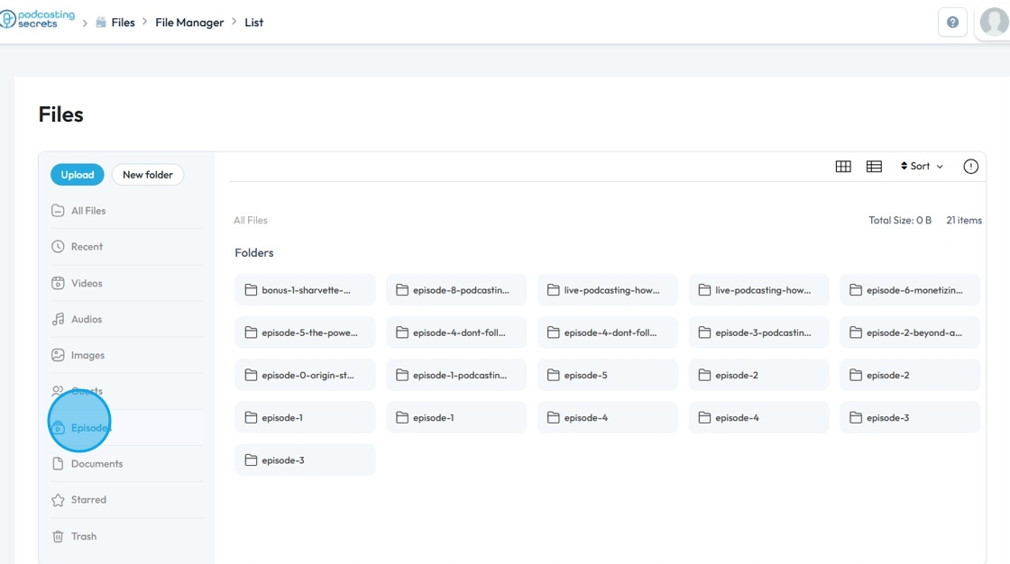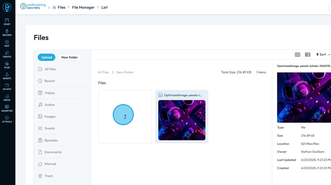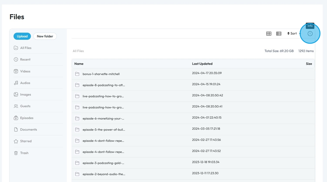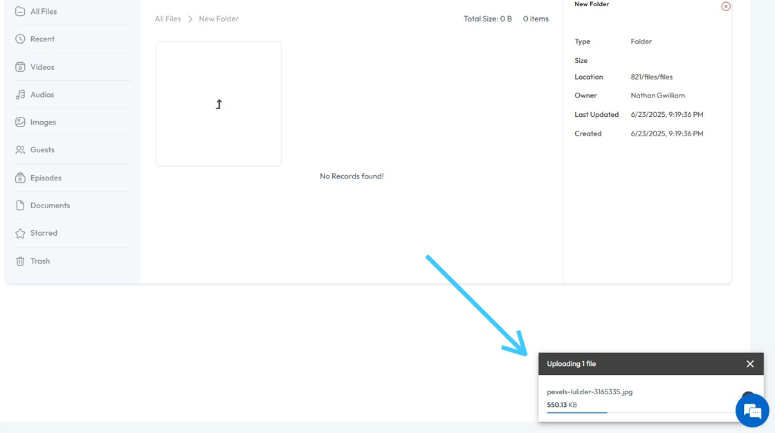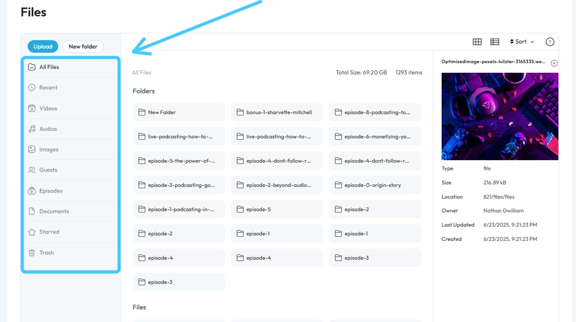 Storage Directory: Refers to the main area where your uploaded files (like audio, video, documents, and images) are kept and organized. It acts like a central folder that holds all the content you've uploaded for use in your podcast episodes or show branding.