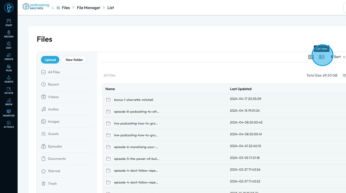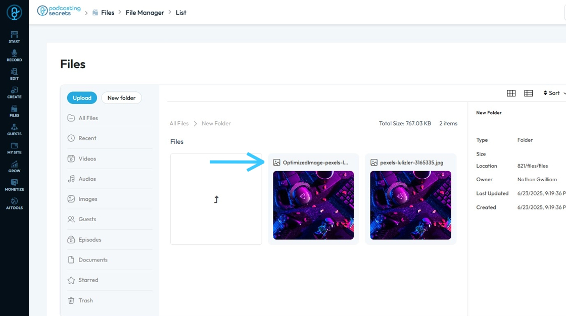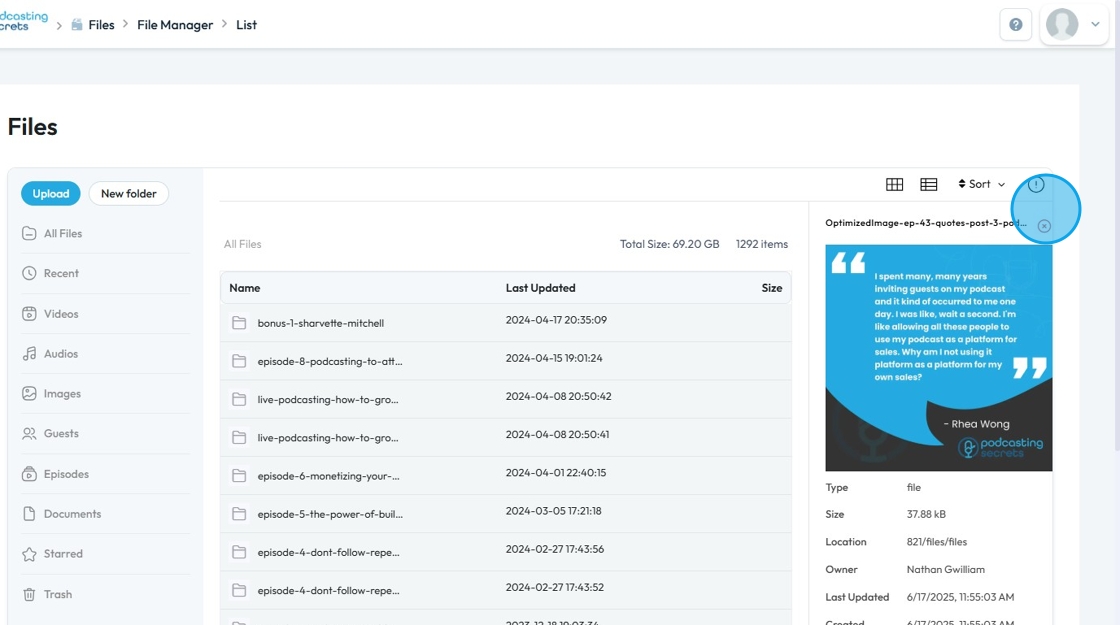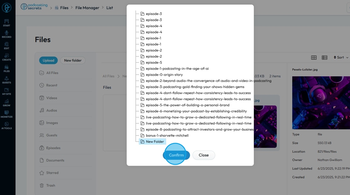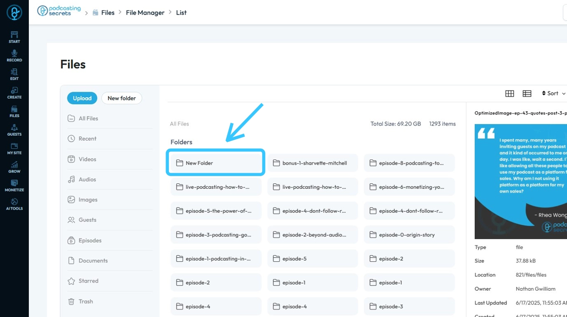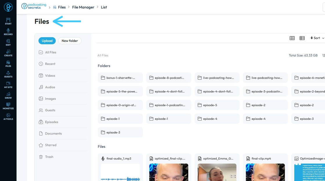 Storage Directory: Refers to the main area where your uploaded files (like audio, video, documents, and images) are kept and organized. It acts like a central folder that holds all the content you've uploaded for use in your podcast episodes or show branding.