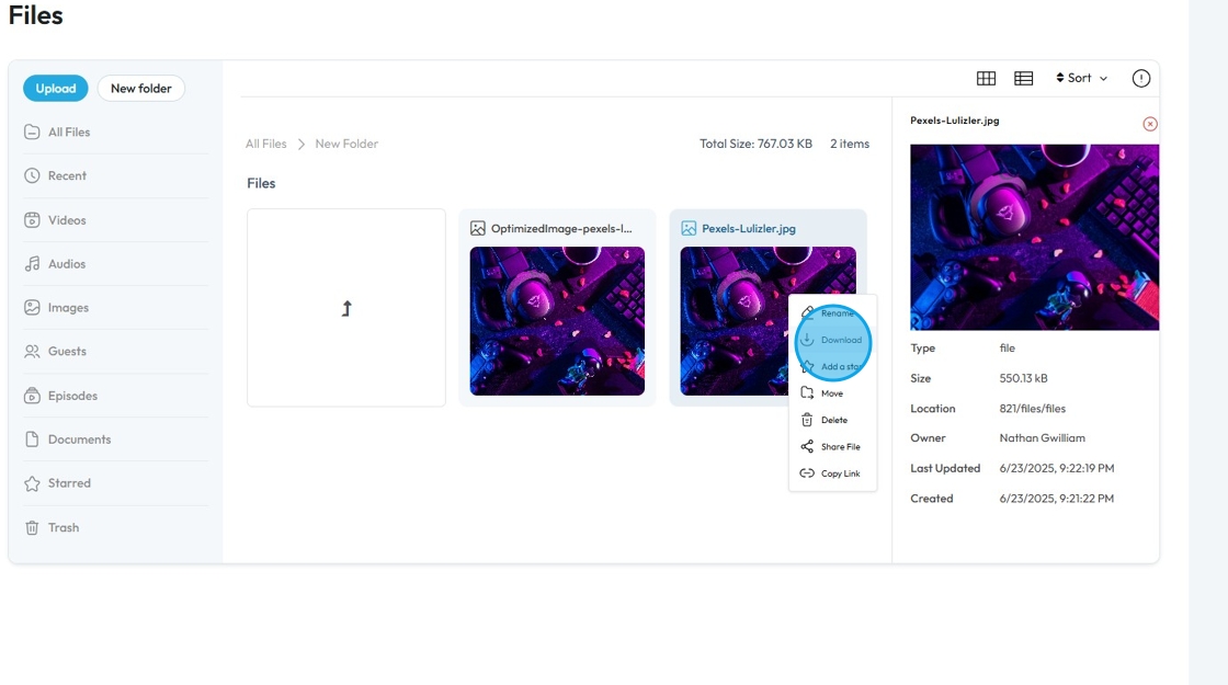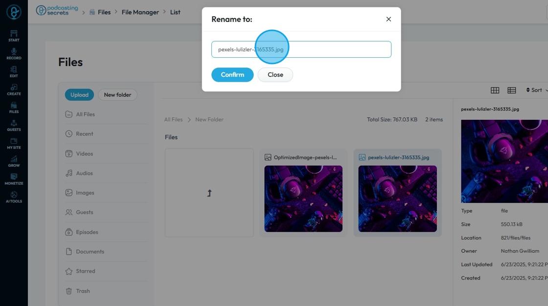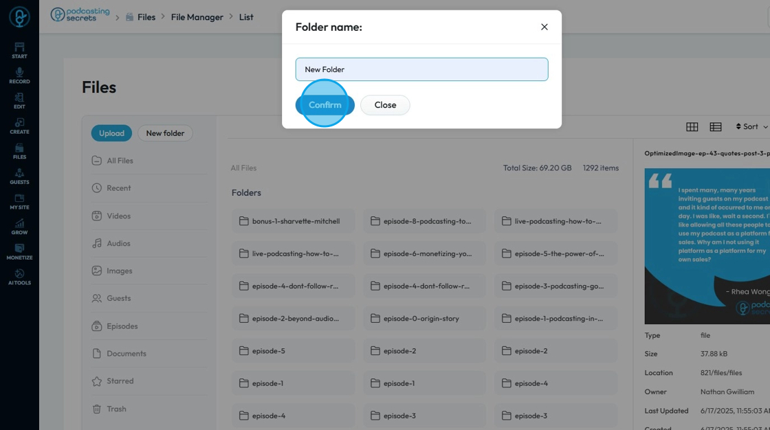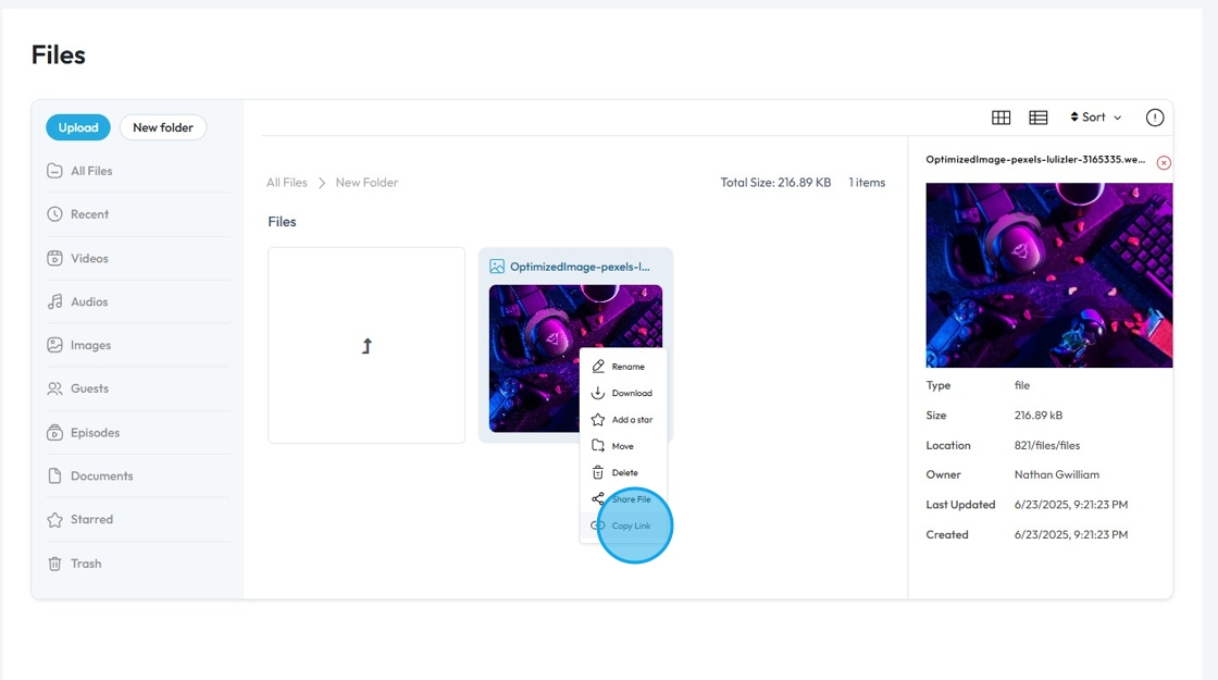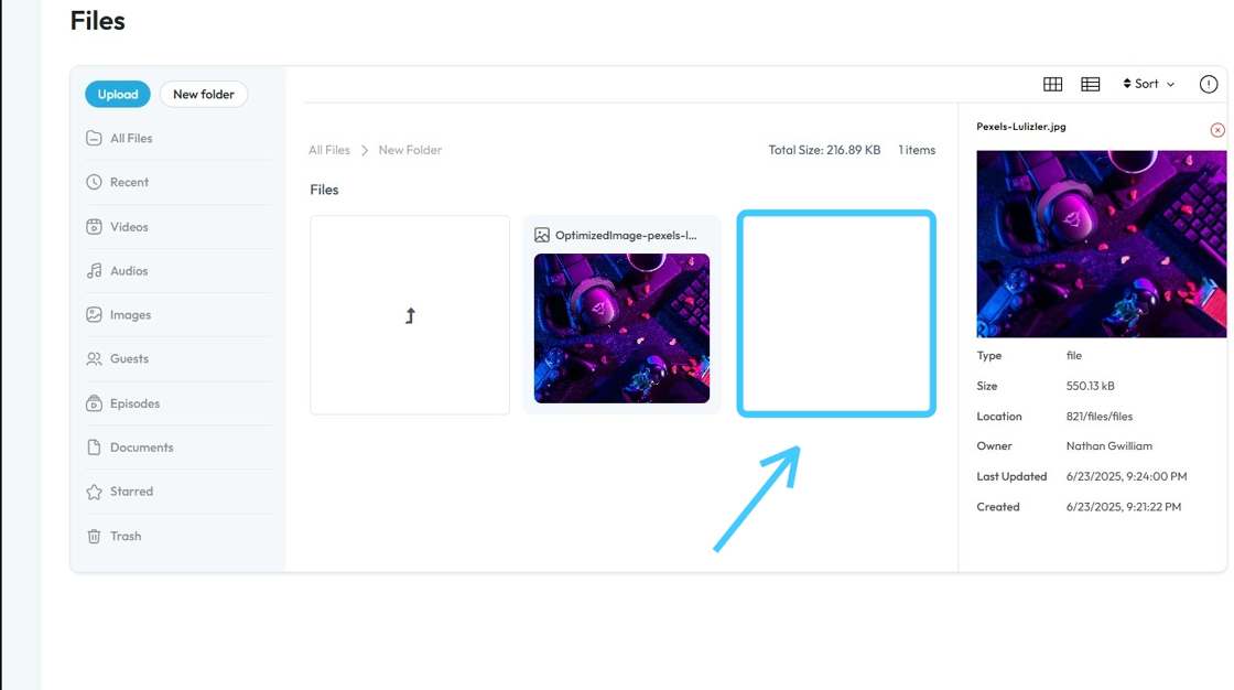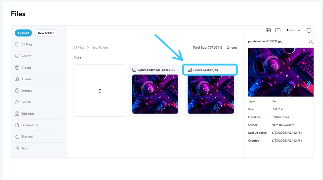 Storage Directory: Refers to the main area where your uploaded files (like audio, video, documents, and images) are kept and organized. It acts like a central folder that holds all the content you've uploaded for use in your podcast episodes or show branding.