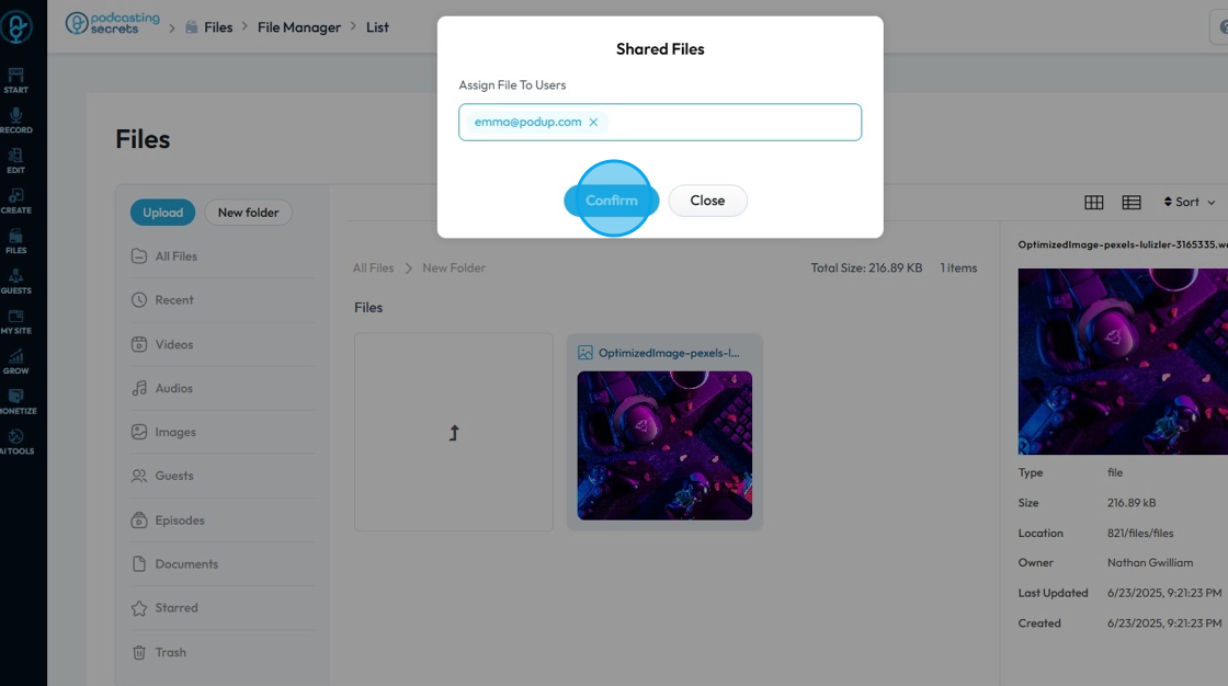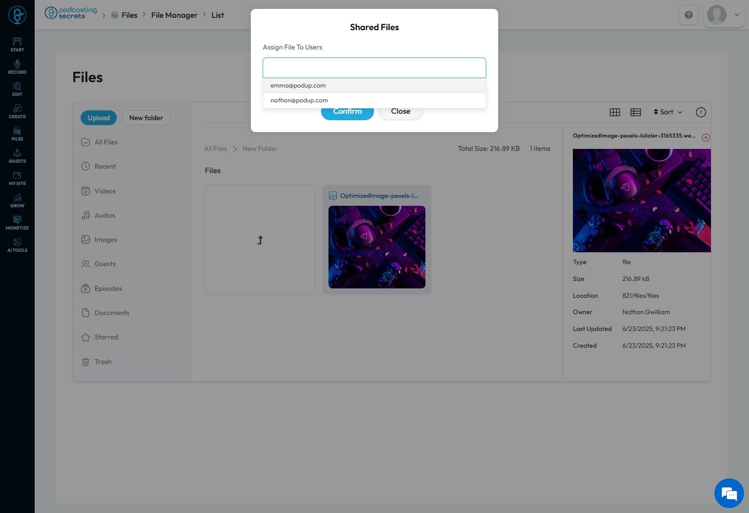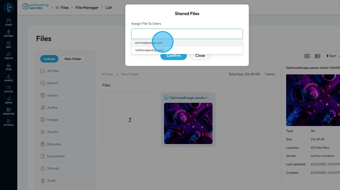 35. To "Share File" or "Assign File" to a user within PodUp, right-click the file and select "Share File"