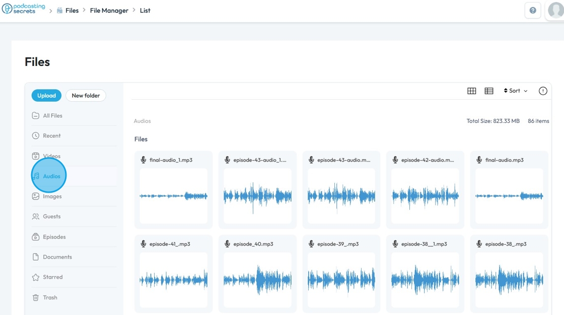45. Clicking "Audios" will show only the "Audio" files present on the PodUp drive.