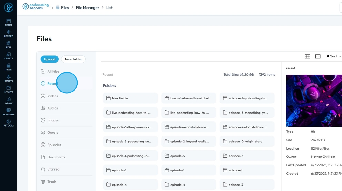 43. Click "Recent" to look at all the Files which got Recently added on PodUp