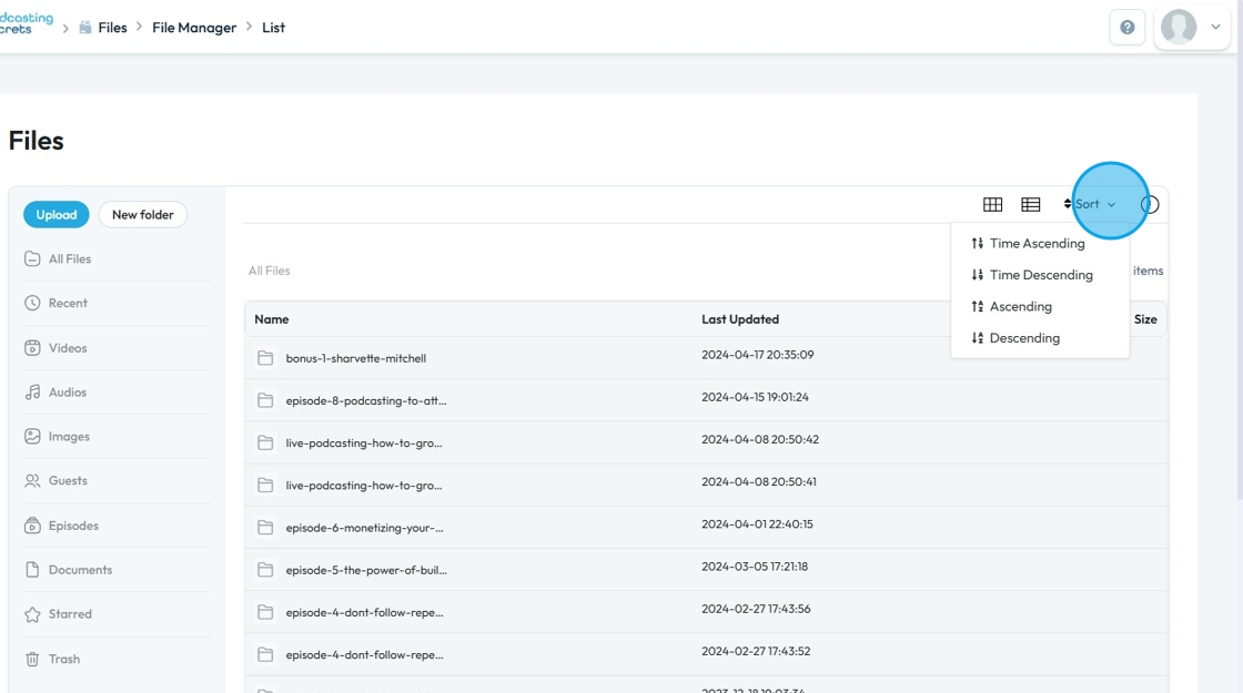 9. To change the "Sort Order" of the Files, click on "Sort"