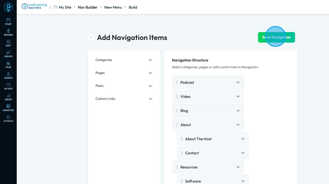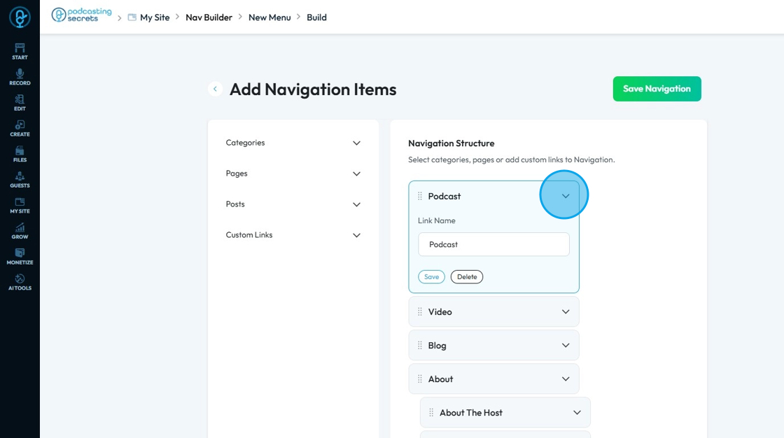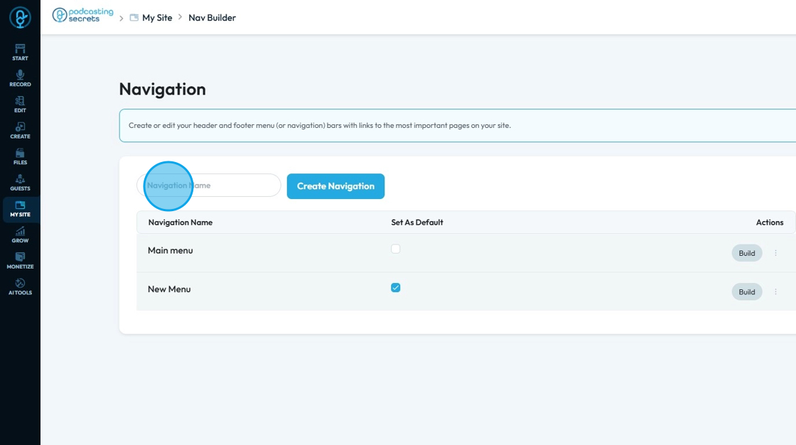 4. Click the "Navigation Name" field and enter the name then click "Create Navigation"