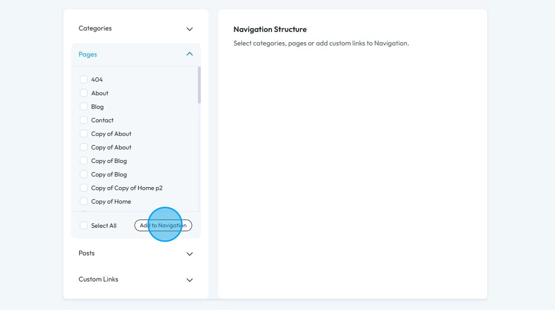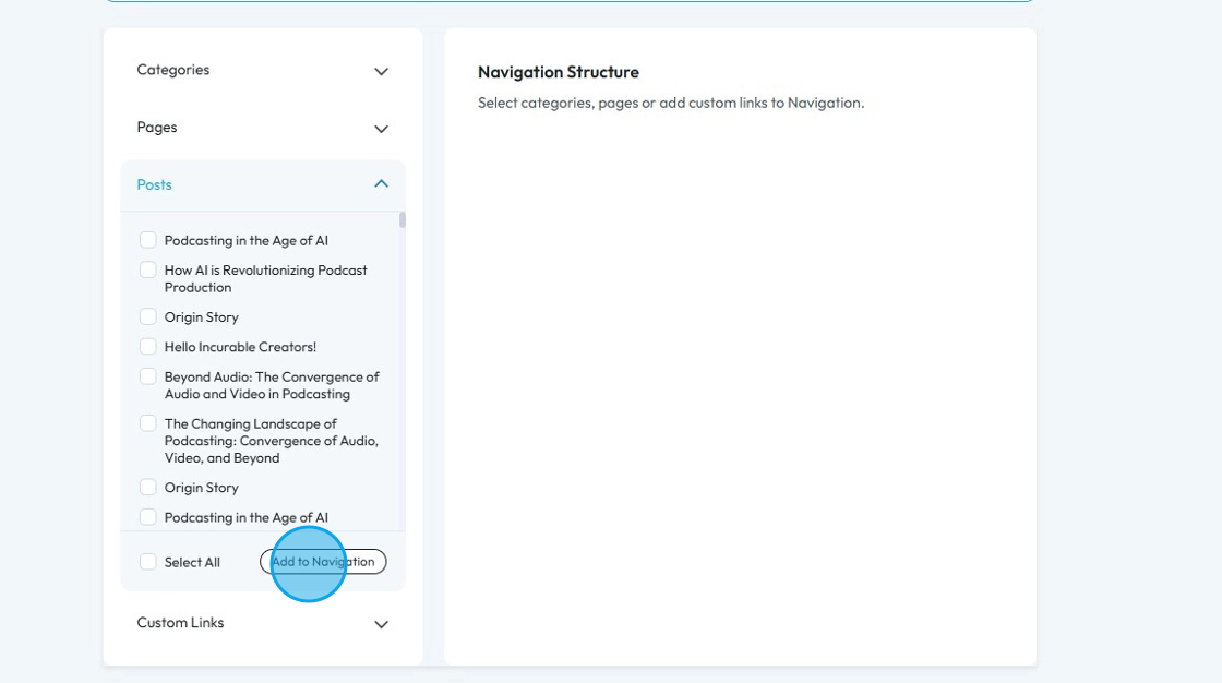 8. Click "Posts" to add a post to Navigation. These are the files you have posted or that have a "Published" status