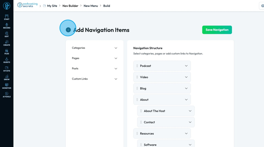 7. Click "Pages" to add a page link to the Navigation. The pages here have been created in "Page Builder" in "My Site"